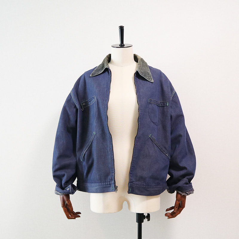 濃いデニムの色合いに、少し色あせた襟のコーデュロイの配色がとても雰囲気あるジャケットです。