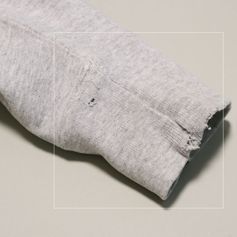 "REVERSE WEAVE" とは、通常の良くあるスウェットのタテ織りを横向きに変え、スウェット特有のタテ方向への縮みを解消し、さらに両脇にリブを付けることで、横への縮みも減らしつつ、運動性能をアップさせ、さらに着心地も良くすることに成功した Champion の特許の仕様のもので、Champion のオリジナルのものです。