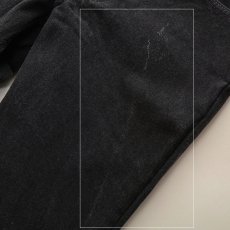 また、”後染め”などと言われる、通常の縦糸白、横糸黒で織られたデニム地ではなく、縦横ともに白い糸で織られたデニム生地を裁断前に染めた、生地染めのデニム地が使われ作られた、"スーパーブラック"と呼ばれたブラックデニムの物です。