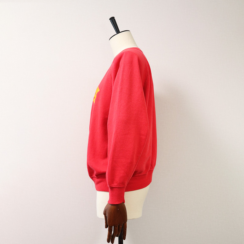 少し褪せて、オレンジがかった赤ボディーにオレンジイエローのプリントが映える、カレッジプリントらしい良いデザインのスウェットです。