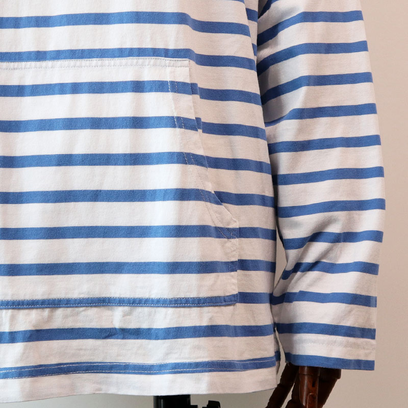 バスクシャツらしいボーダーですが、形はフードが付き、腹部にはカンガルーポケットの付くデザインの物です。