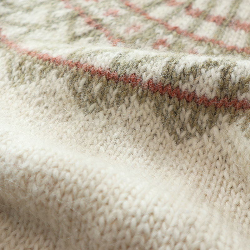 白地にオリーブとピンクの配色がとても温かみのあるセーターです。