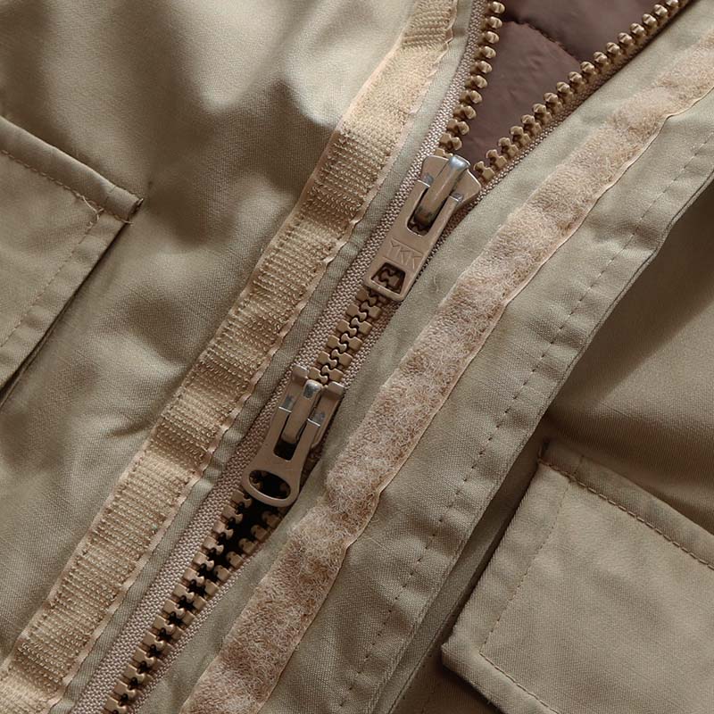 ジップは YKK の大型のWジップが付き、前立てはベロクロテープで留める仕様です。
