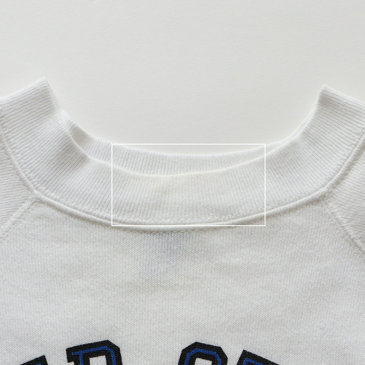 白ボディーに、青と黒と赤のプリントが映える、オールド感のあるスウェットです。