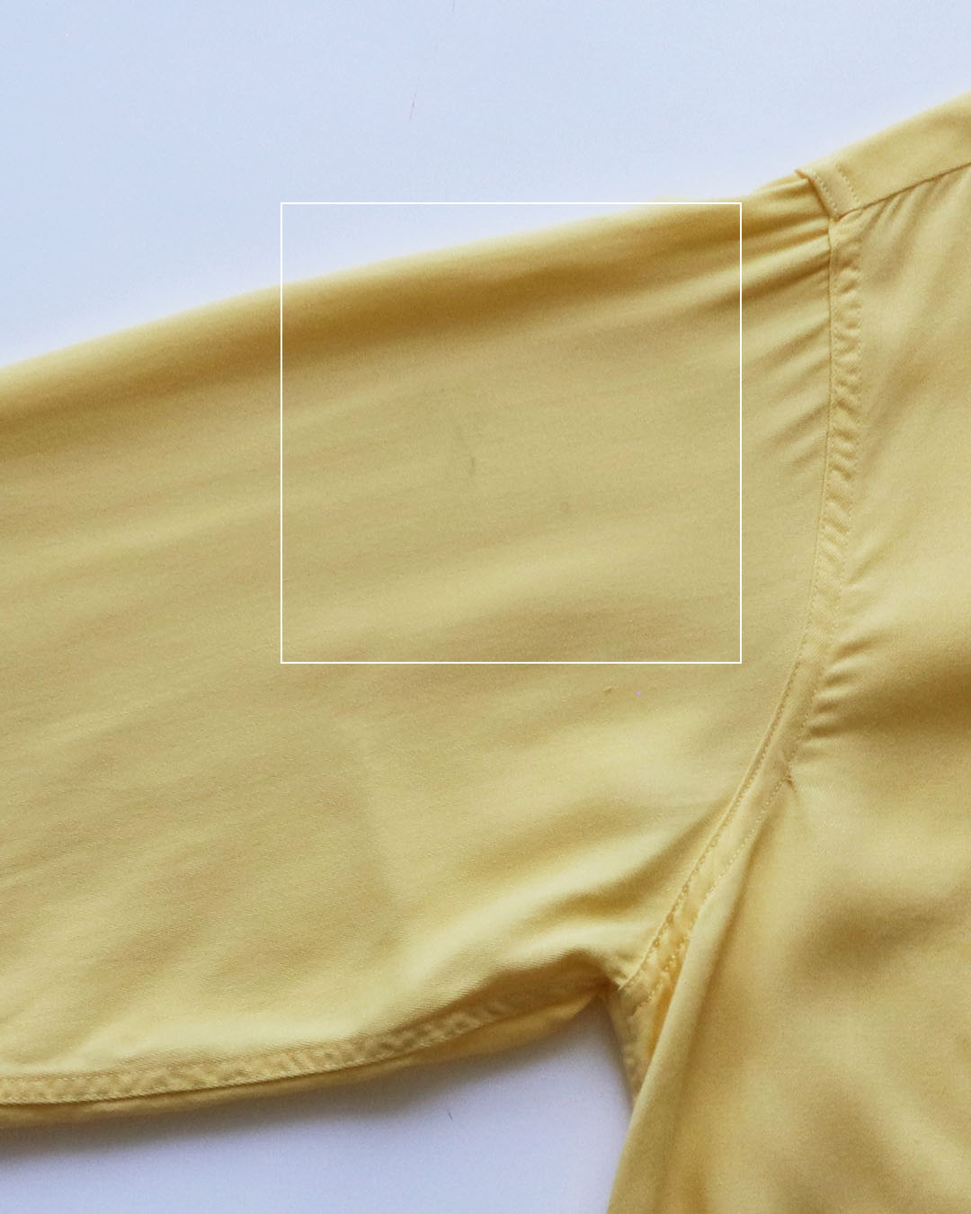 襟には襟芯(カラーキーパー)は無く、台襟の付かないオープンカラーで、両胸にはフラップの付かないパッチポケットが付き、アームホールはWステッチになった、古いディテールのシャツです。