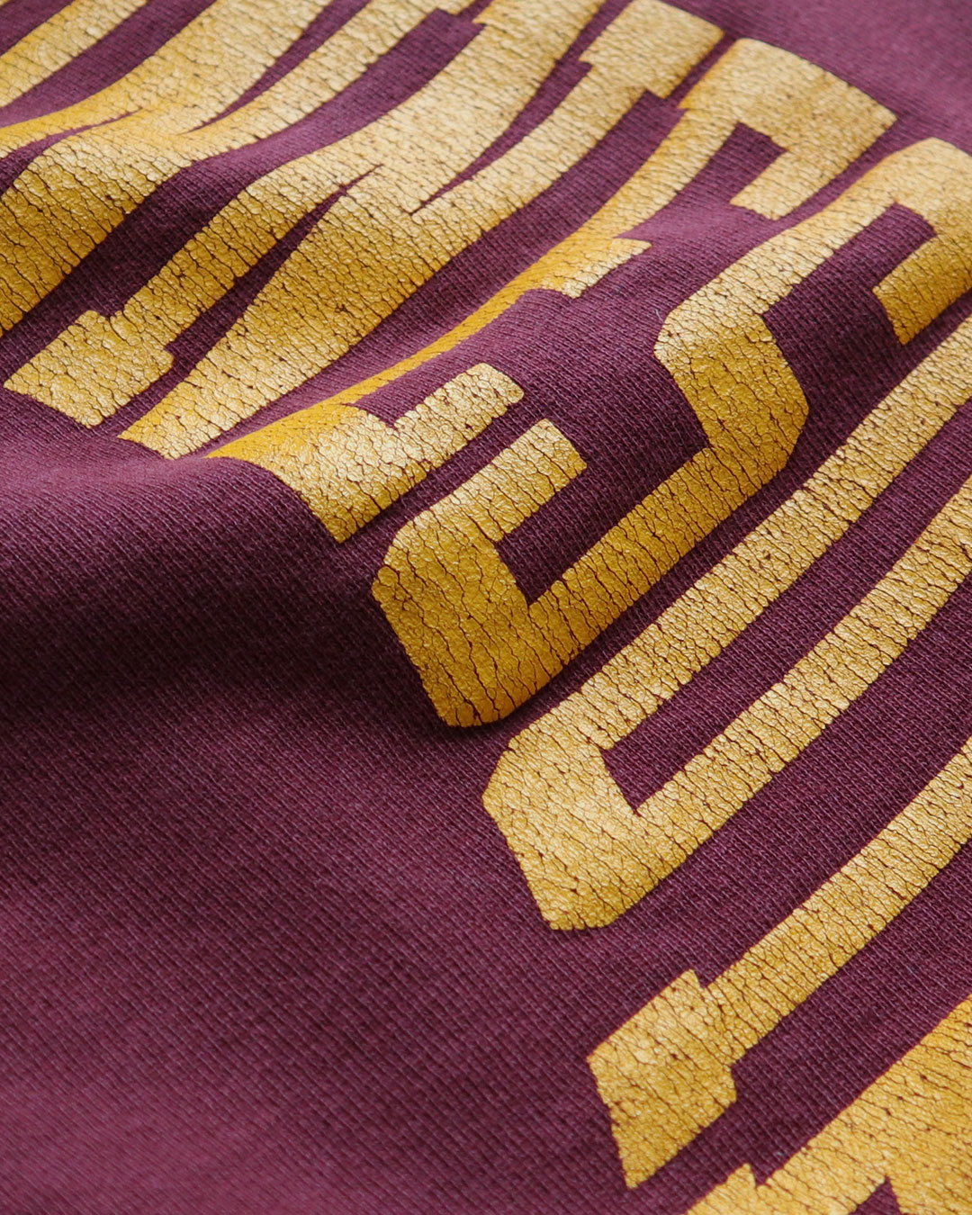 少し褪せたバーガンディーのボディーに、ひび割れたオレンジのプリントが良い雰囲気のスウェットです。