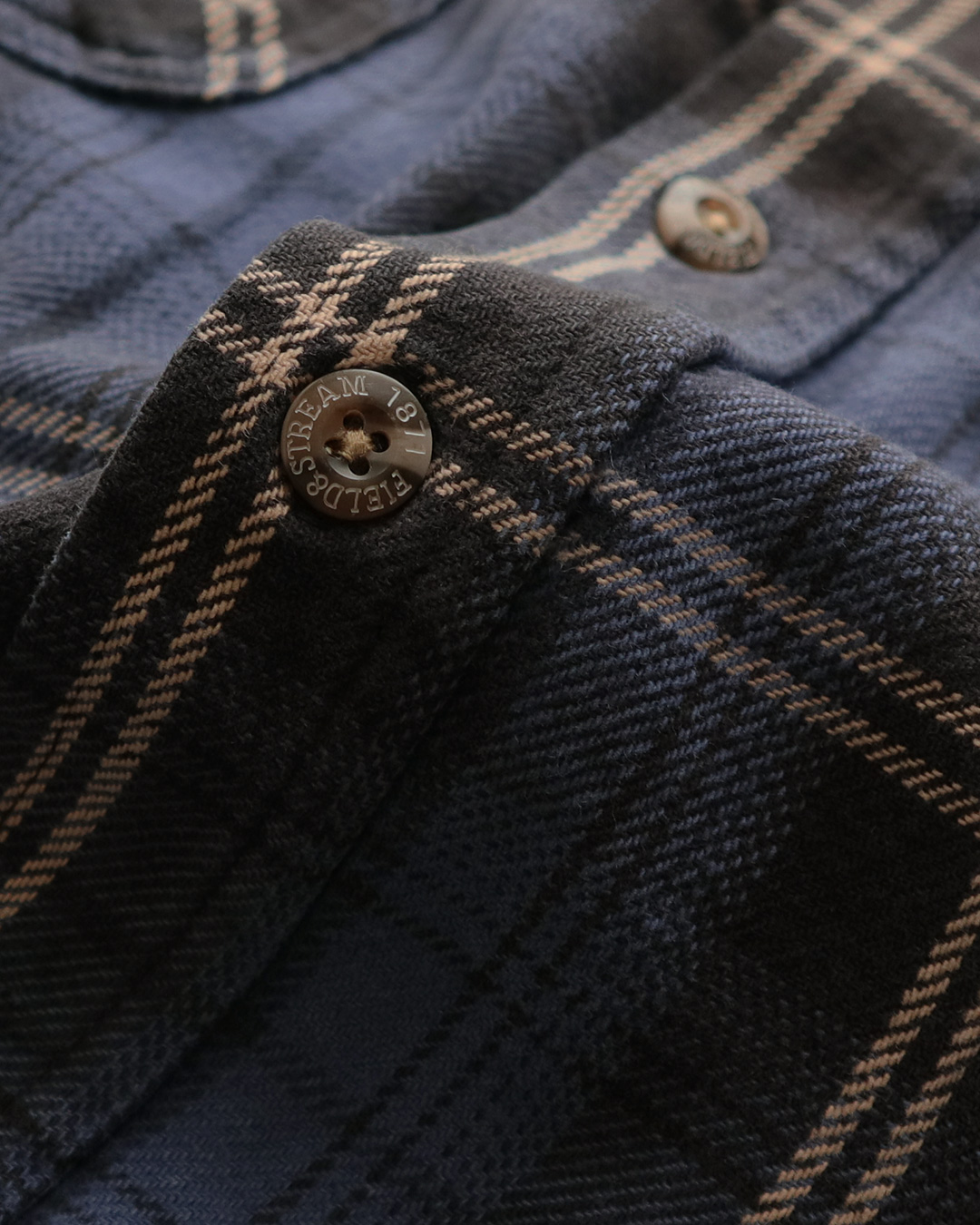 形は両胸にフラップポケットの付く、定番のシャツの形で、ボタンはマーブルに、 FIELD & STREAM のロゴの入る4つ穴の物が付きます。