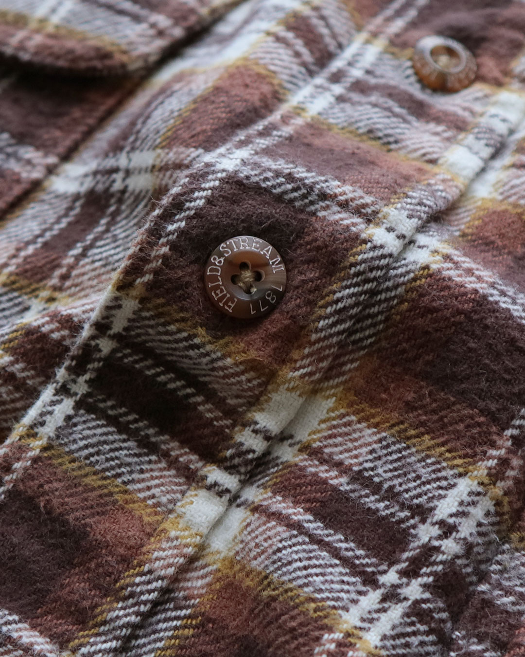 形は両胸にフラップポケットの付く、定番のシャツの形で、ボタンはマーブルに、 FIELD & STREAM のロゴの入る4つ穴の物が付きます。