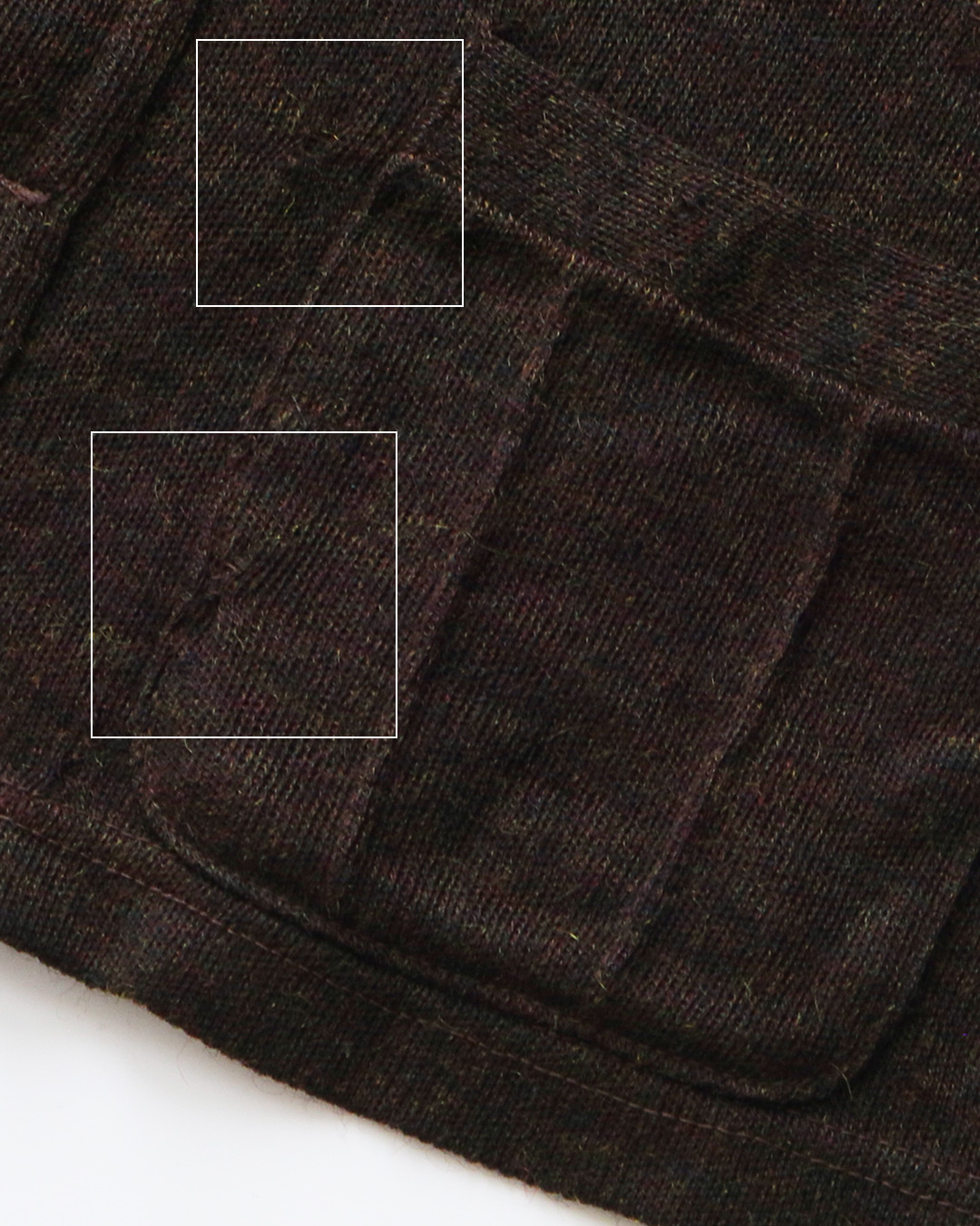 裾にパッチポケットがつき、両肘には、裏側からリブ編みの生地が張られた肘当てがついています。