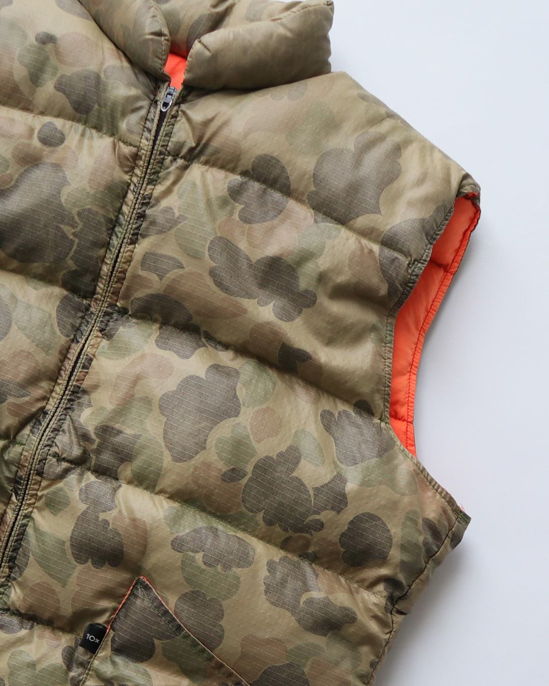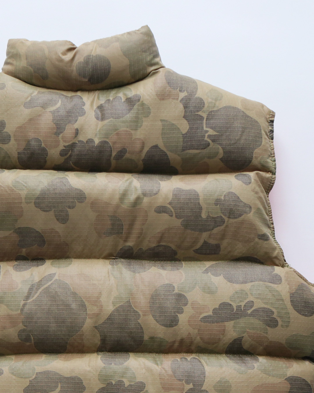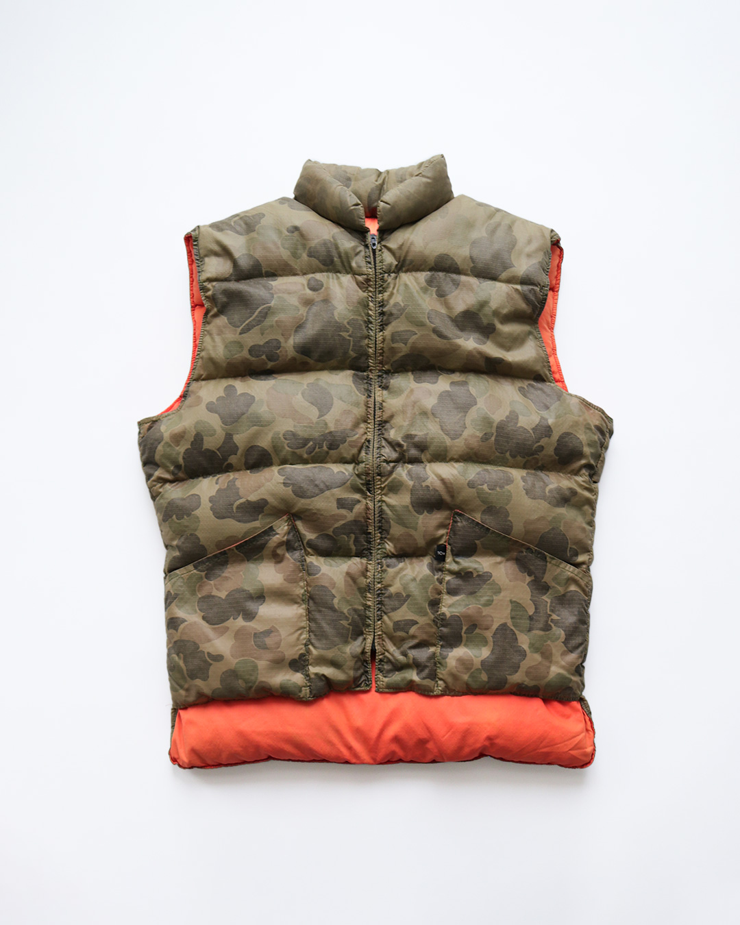 少し色褪せたカモ柄が、とても良い雰囲気のダウンベストです。