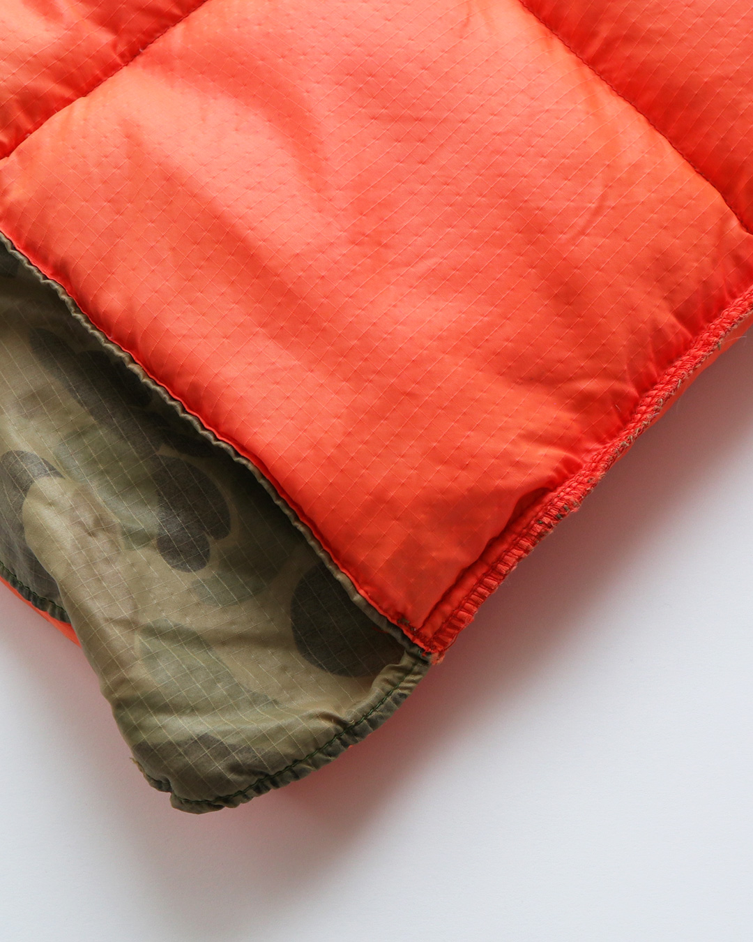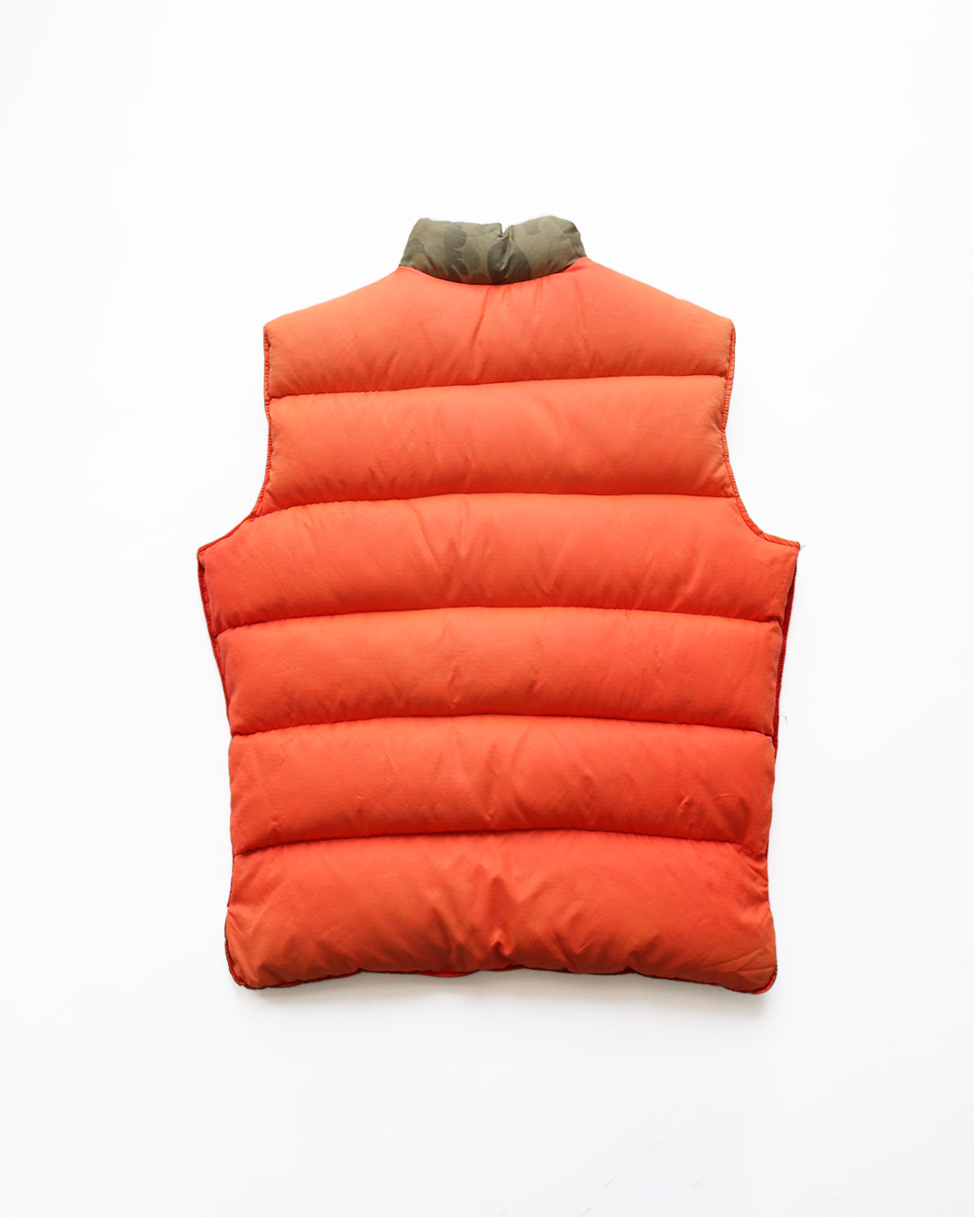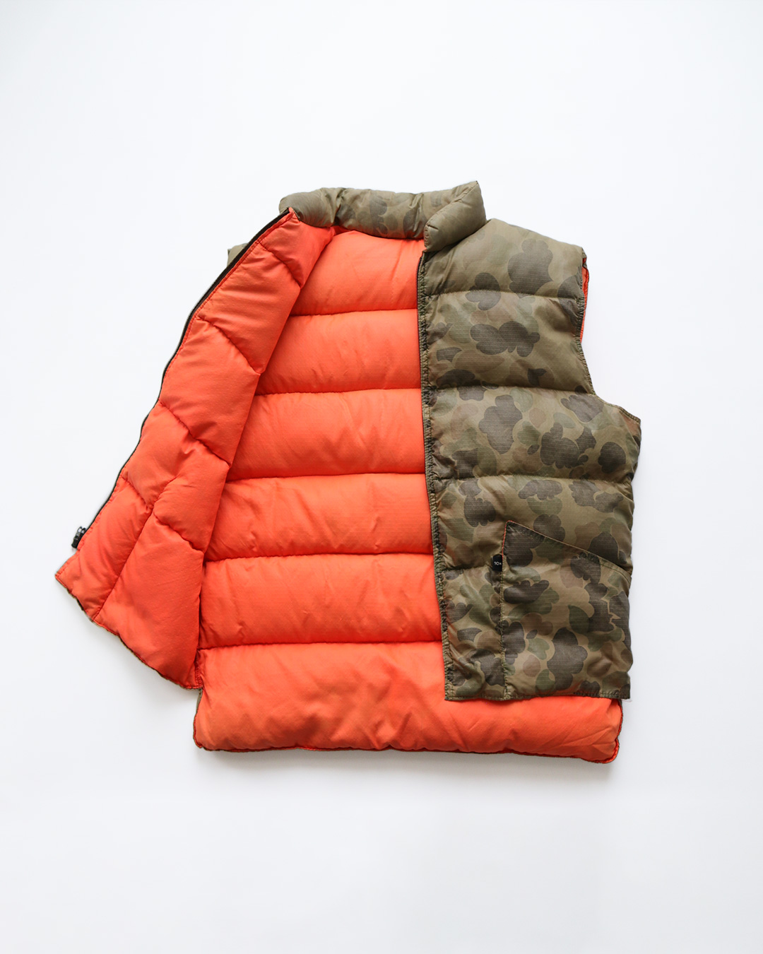 少し色褪せたカモ柄が、とても良い雰囲気のダウンベストです。
