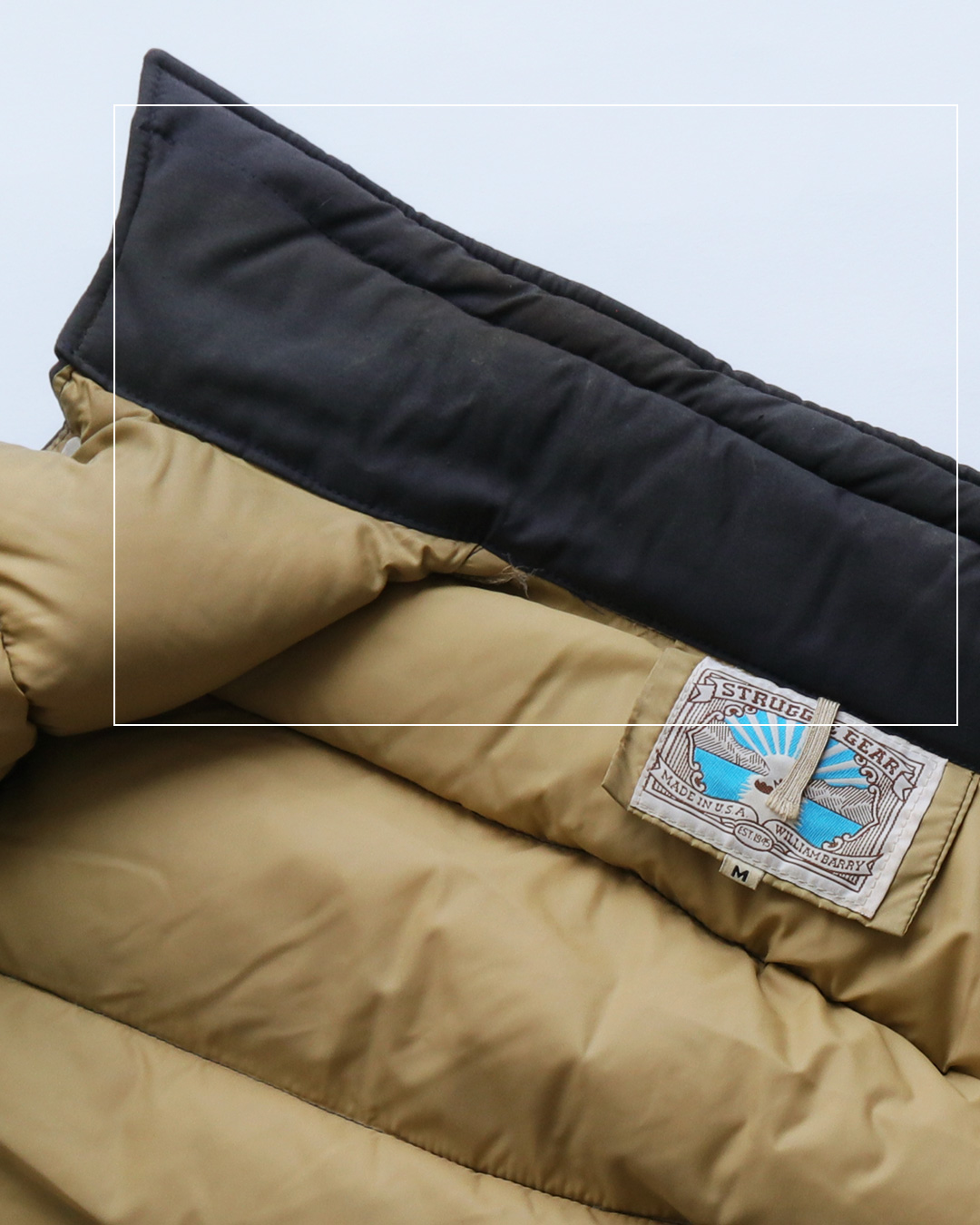 形はスナップボタンで留めるダウンベストで、肩幅狭めで丈の長さのある着やすい良い形の物です。