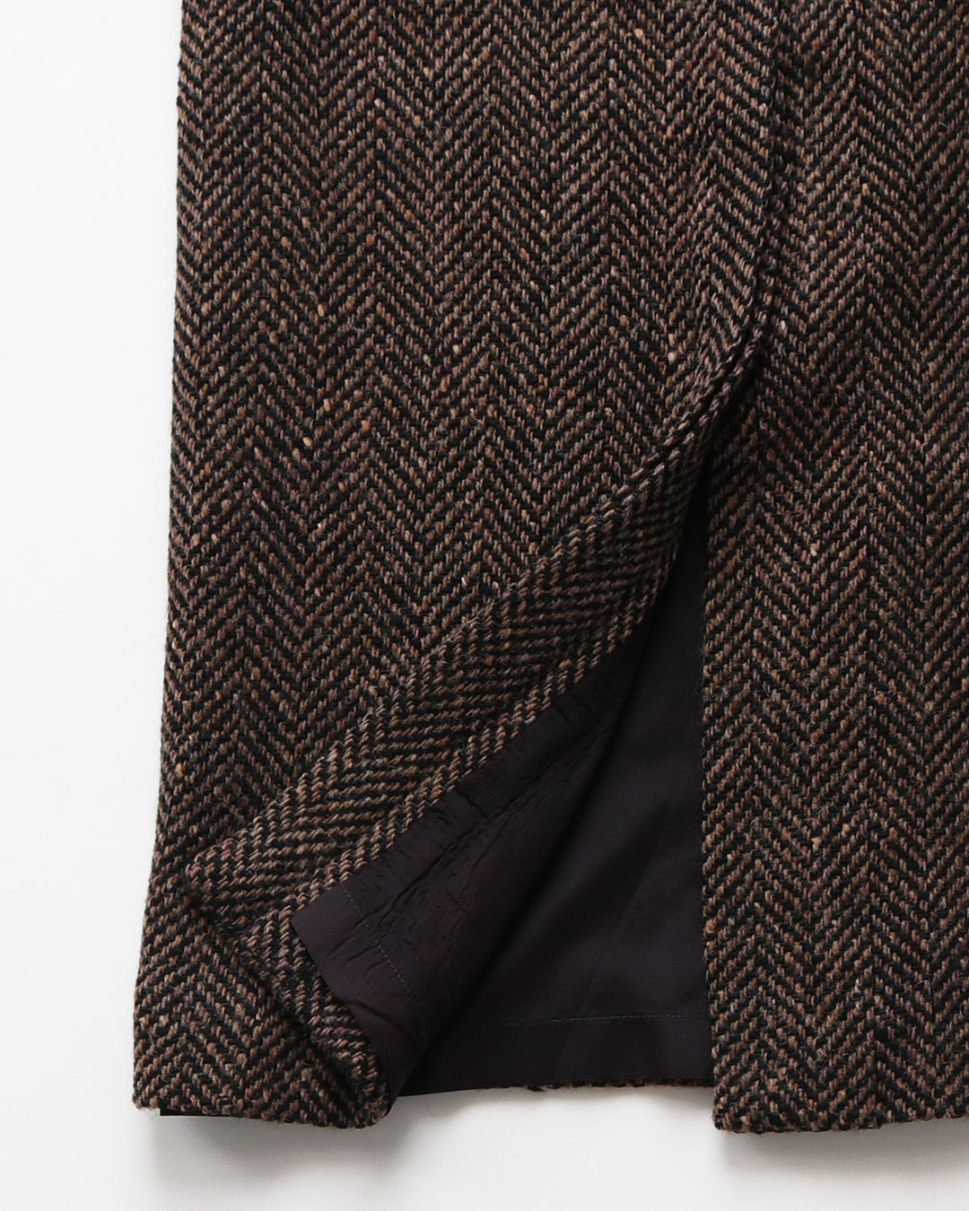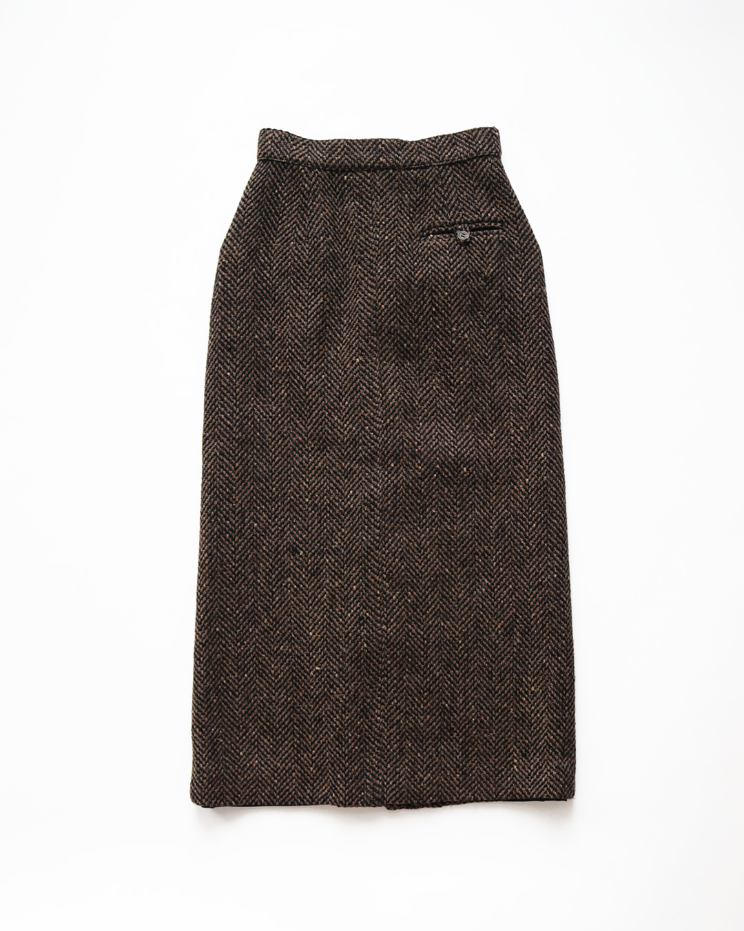 ブラウンと黒のヘリンボーンツイードがとても高級感あり、良い雰囲気のスカートです。