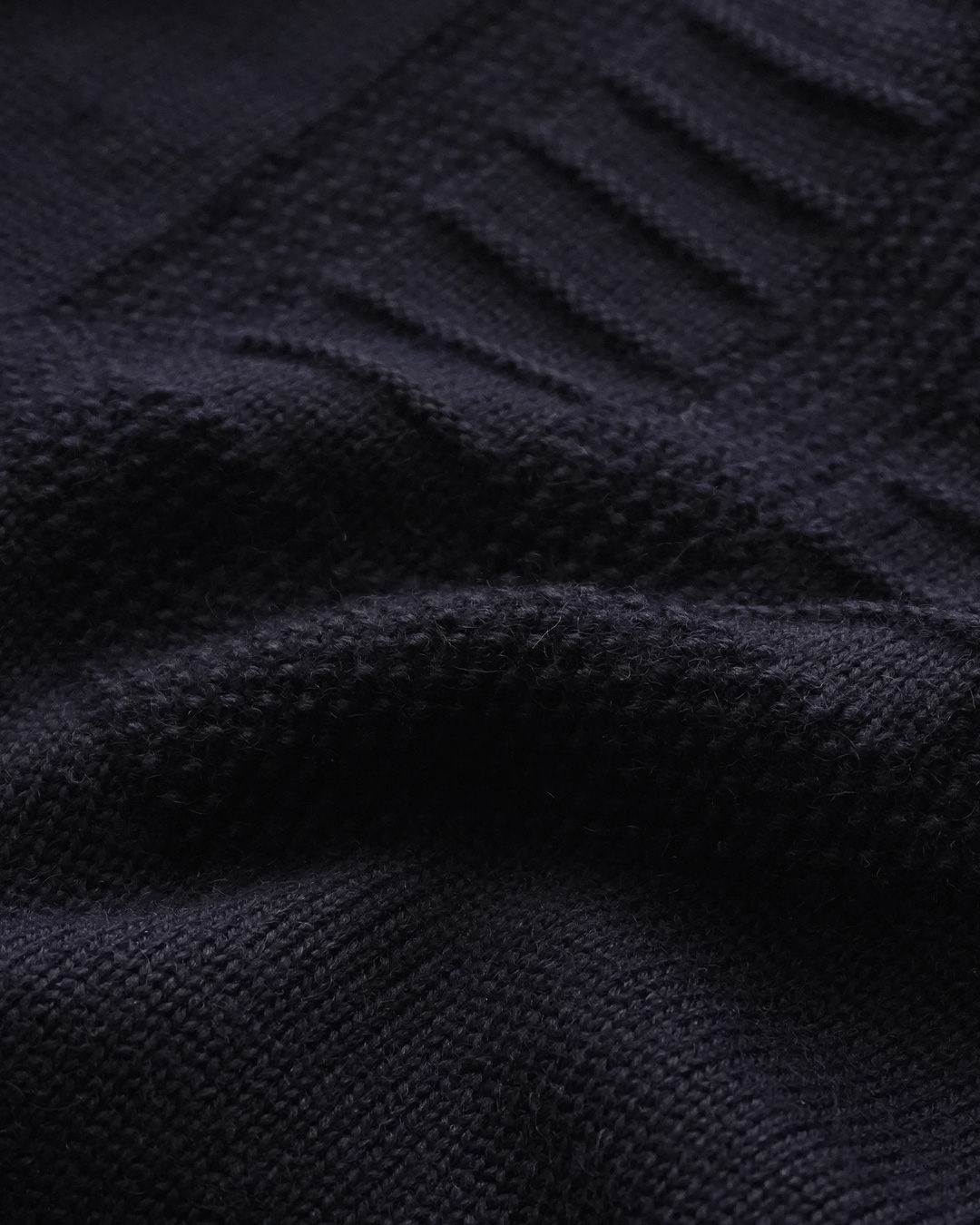 また、首回りは少しハイネックで、胸元に編み柄が入っています。