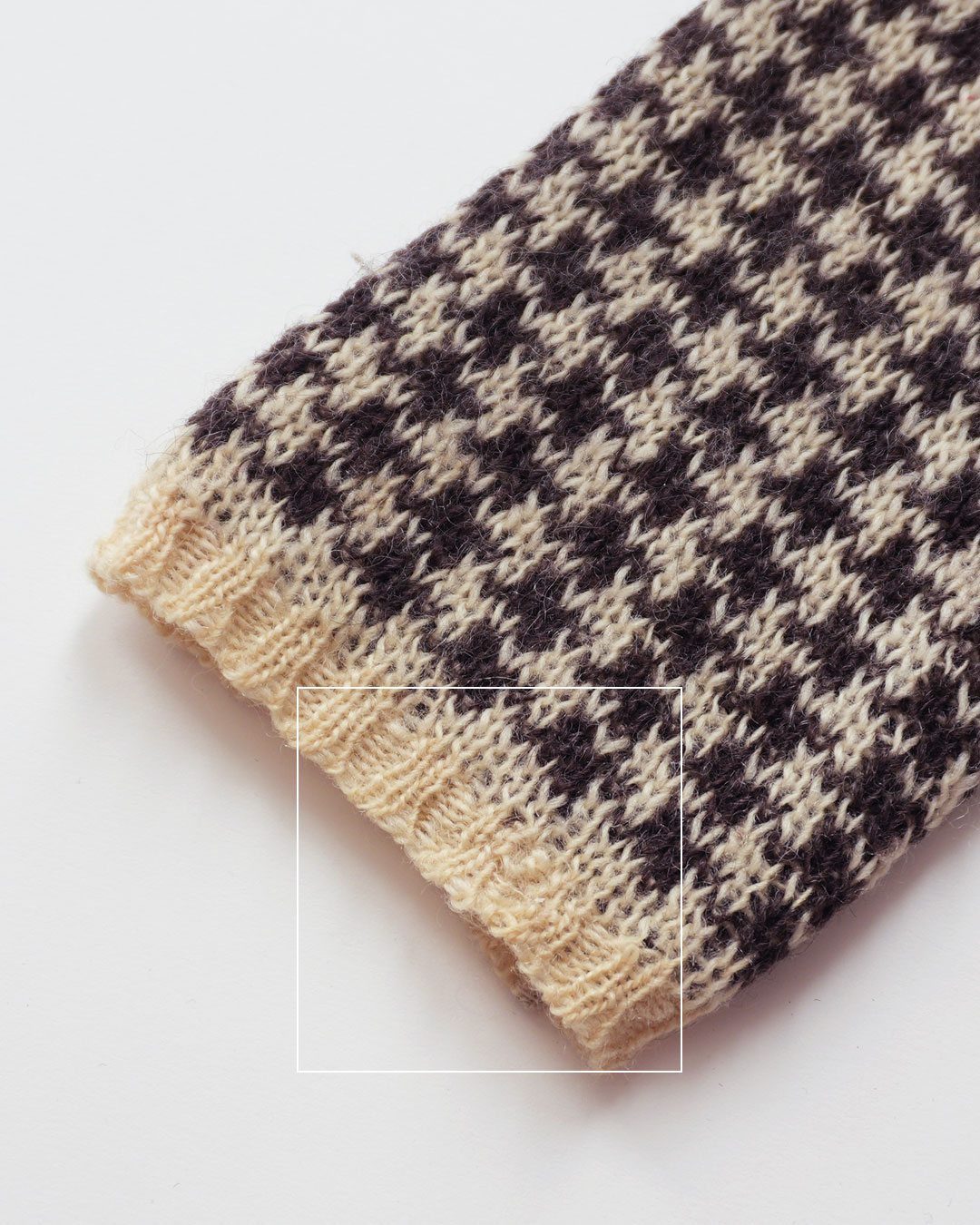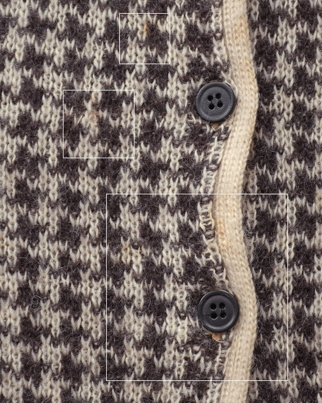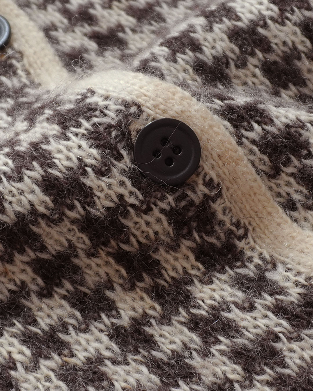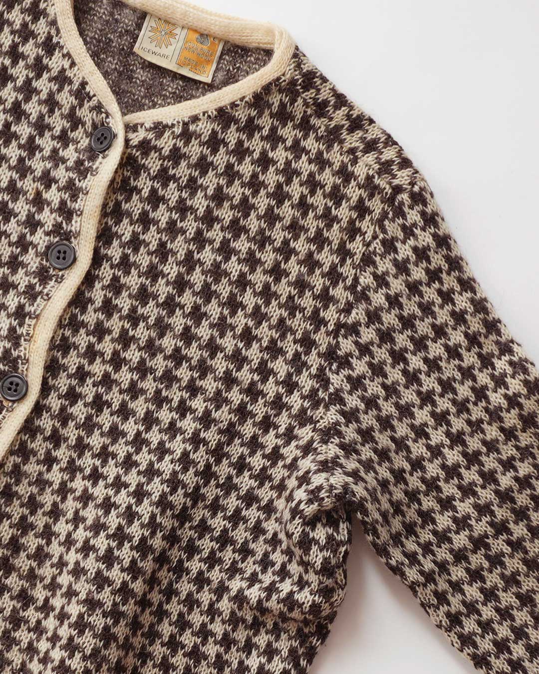 アイスランド製のもので、よくある首の周りに雪柄のような柄が編み込まれたものではなく、全体に千鳥格子柄が編み込まれたアイスランディックカーディガンです。