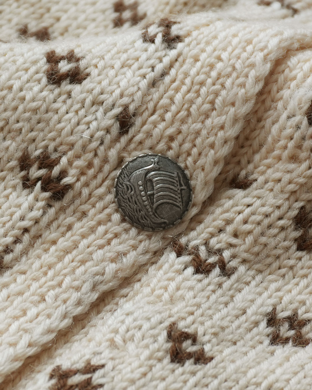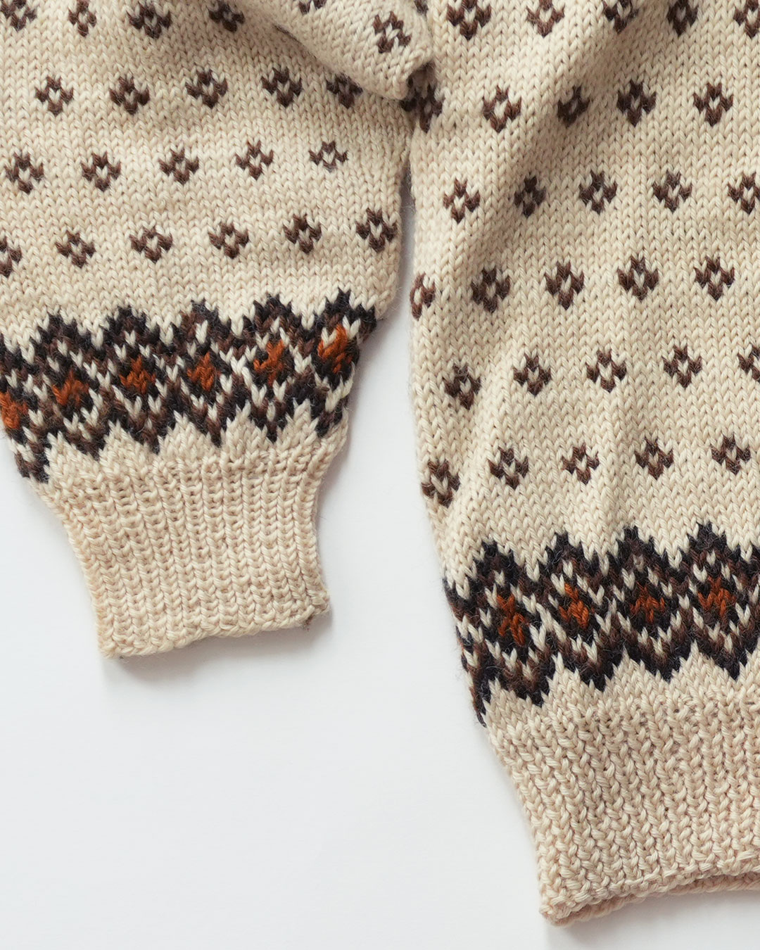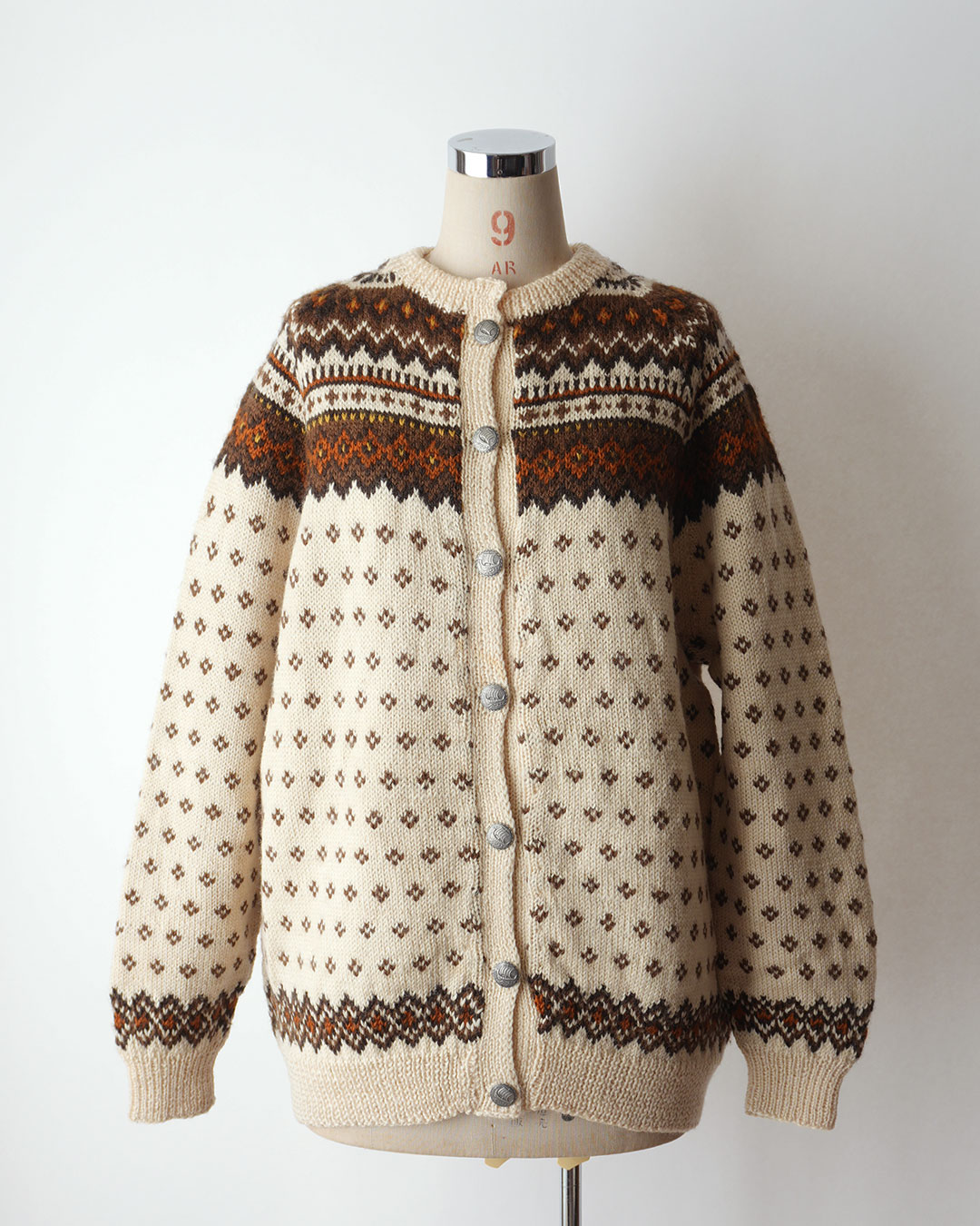 デザインも胸から上、裾にそれぞれ多く柄が編み込まれた、ノルディックカーディガンらしい作りの物です。