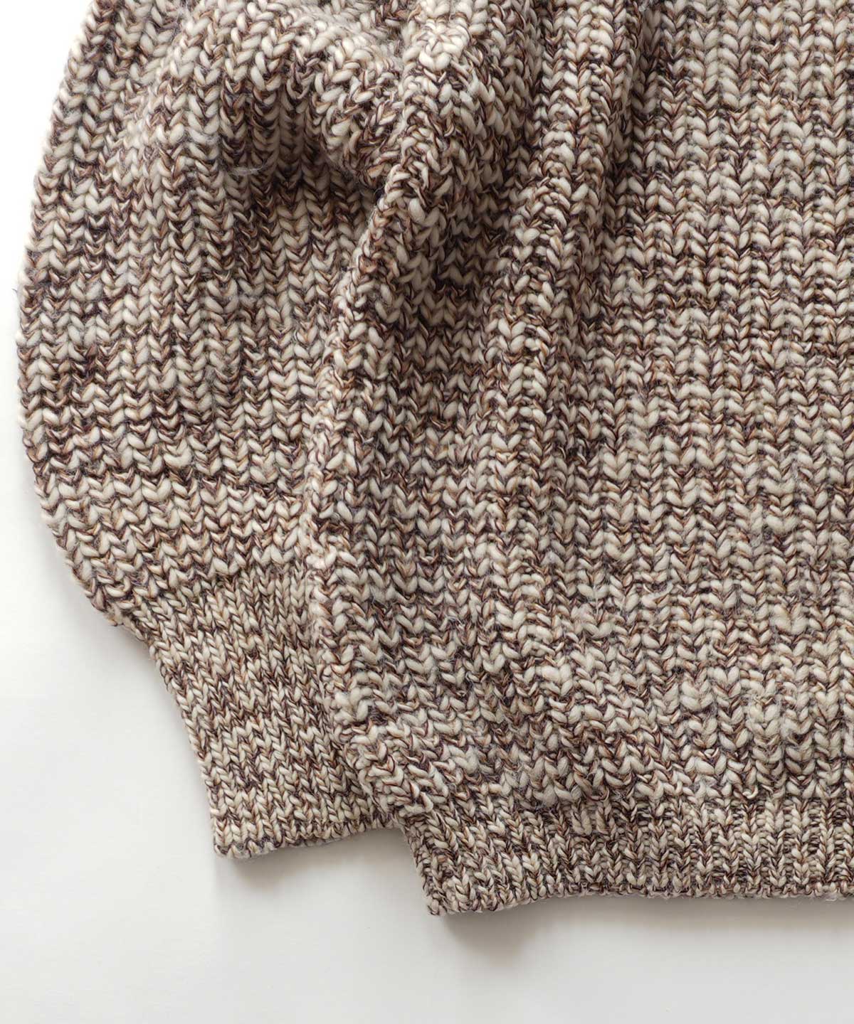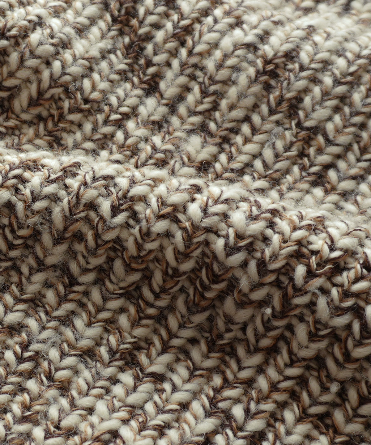 素材は100%ウールの白とブラウン系が混ざる太い糸で編まれたもので、ふんわりとして柔らかいニットです。