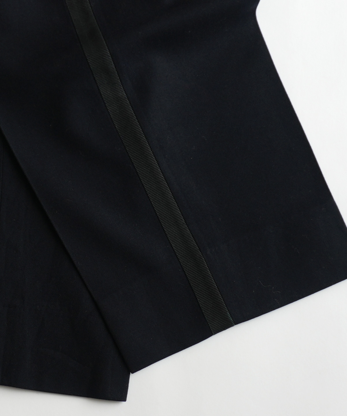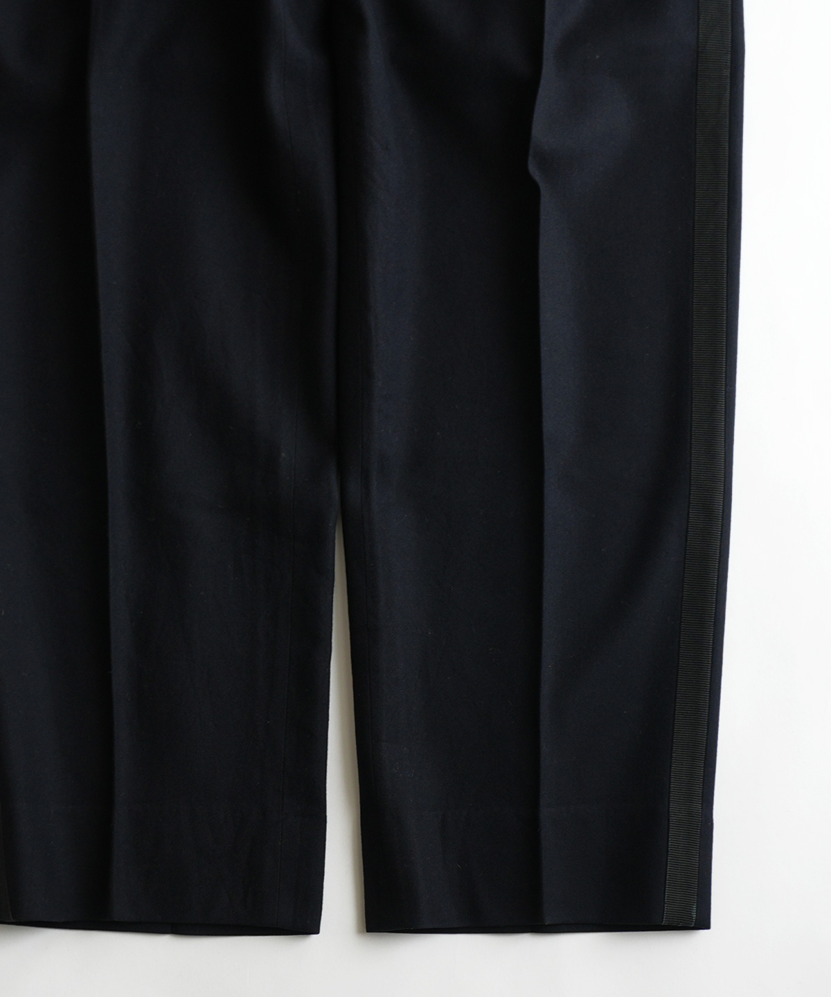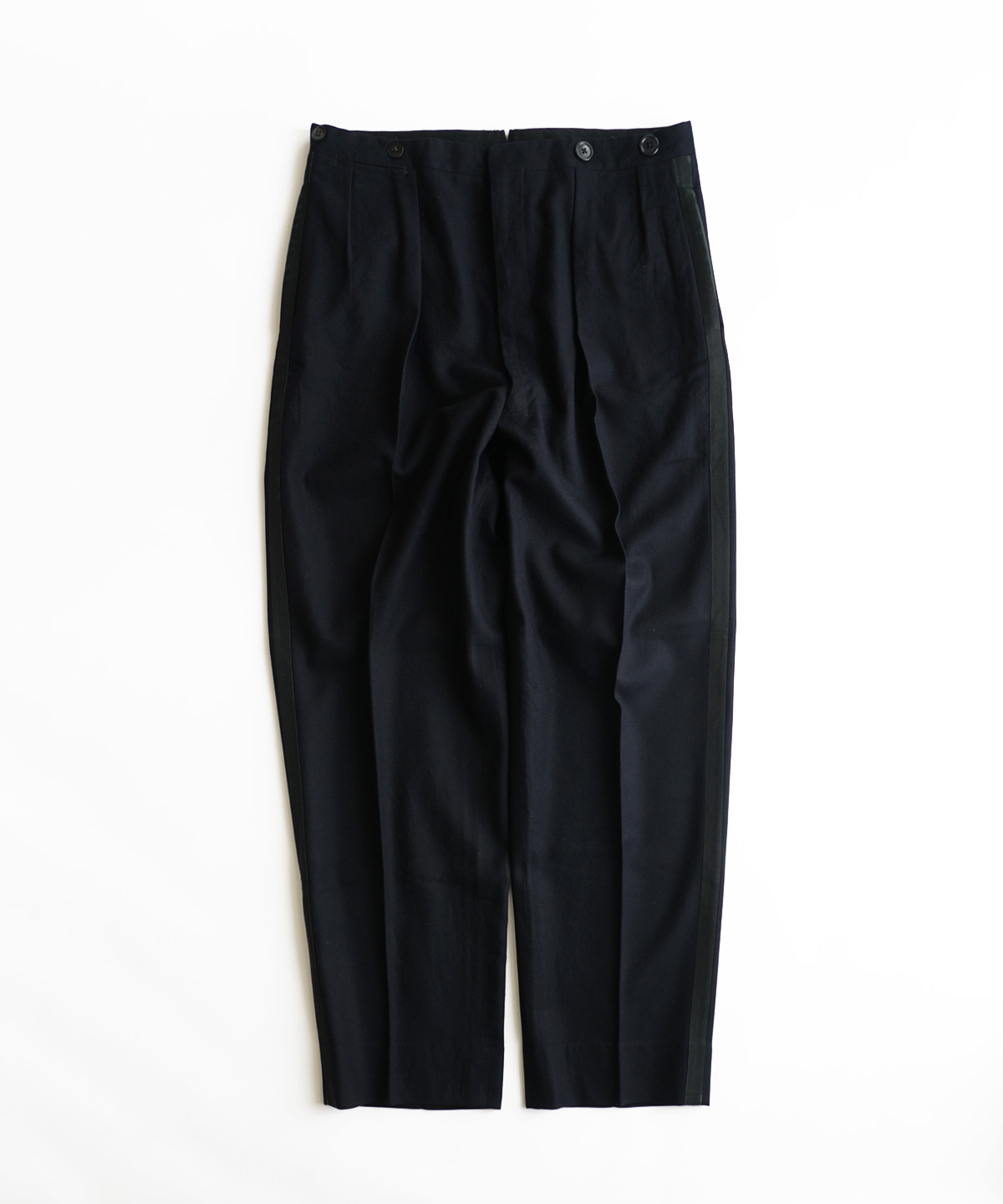 ほぼ黒色の濃い紺色がとてもオールド感のある良い色合いで、生地感も雰囲気ある良いスラックスです。