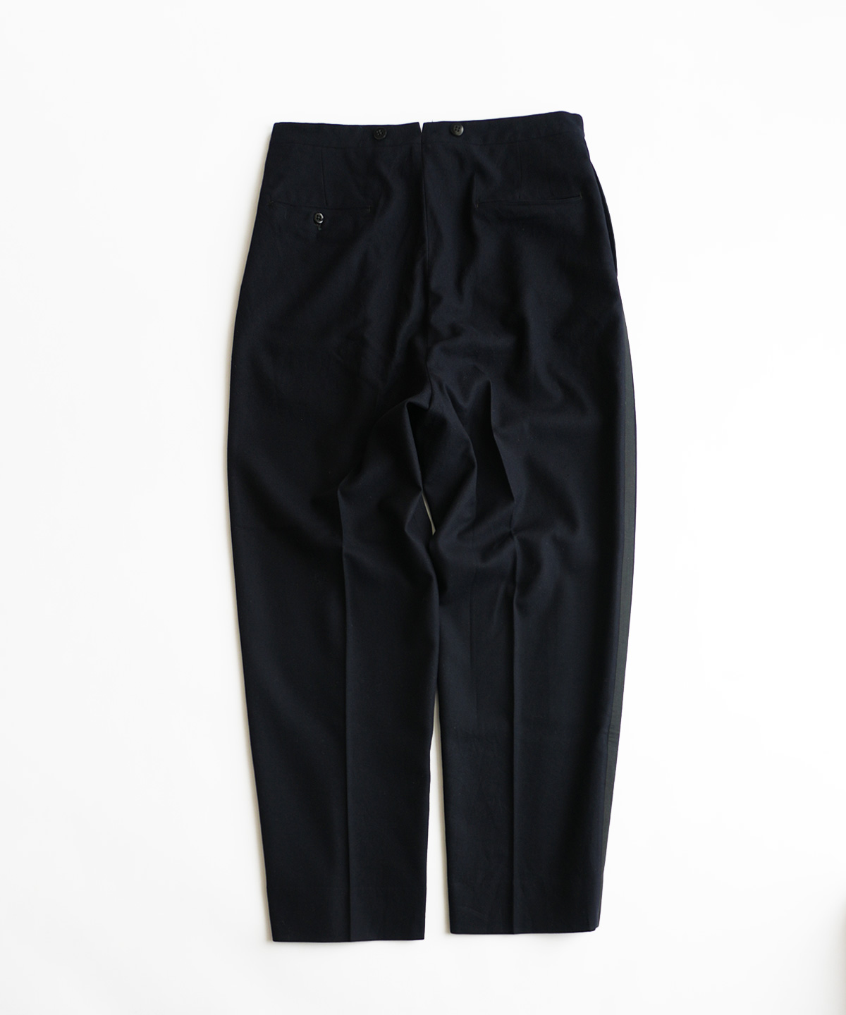 形はタックの入る太目のシルエットで、裾に向かって少しテーパードしたきれいな形のパンツです。