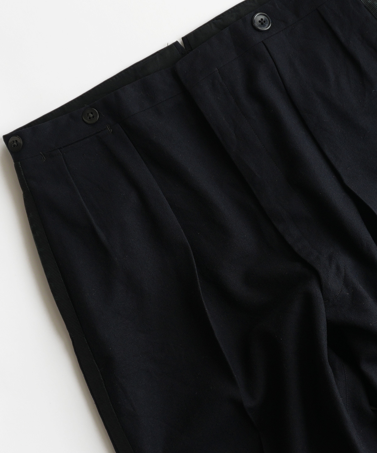 ベルトループは付かず、サスペンダーボタンのみの、サスペンダーで吊ってはくスタイルのパンツです。