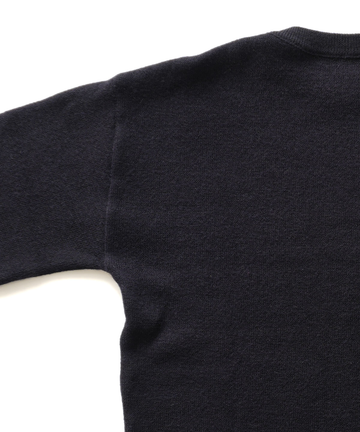 濃いネイビーが落ち着いた色合いで、雰囲気ある良いセーターです。