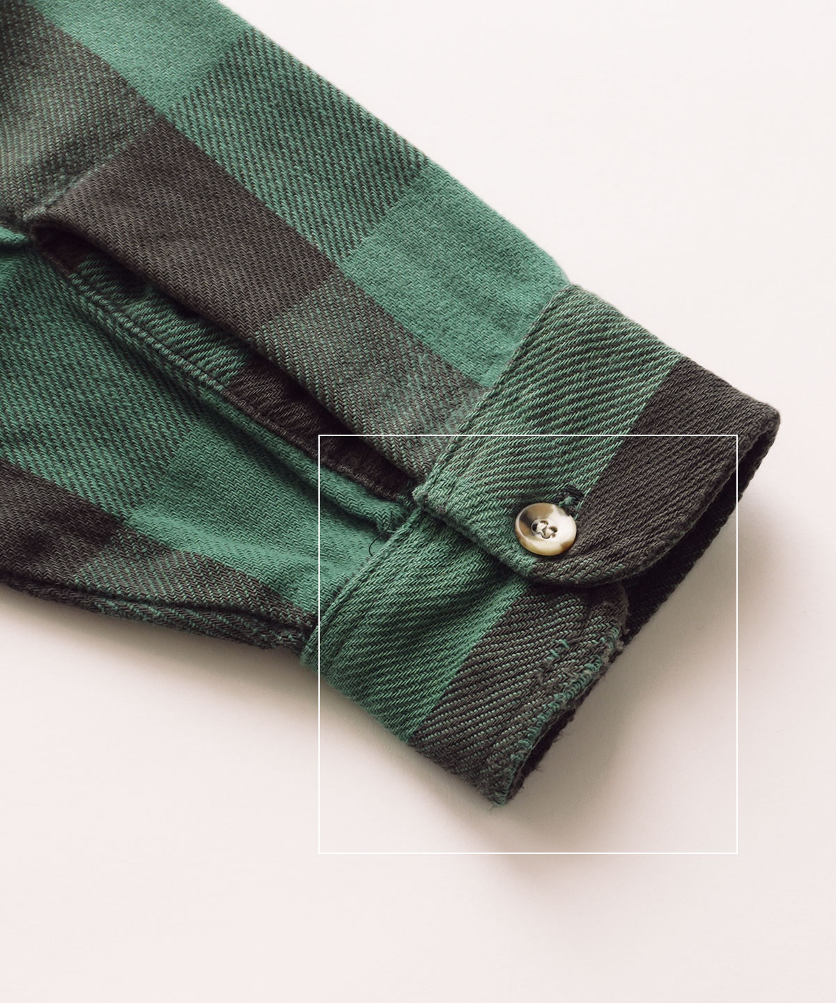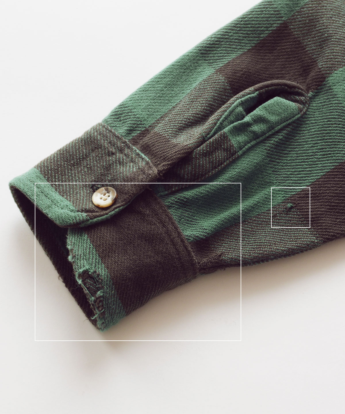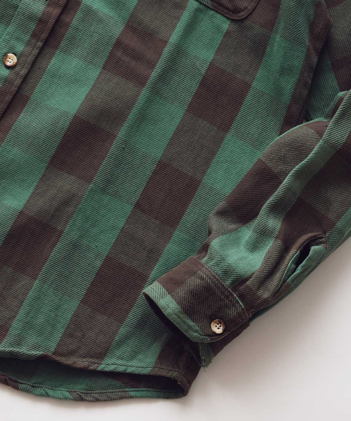 少し色褪せた緑黒のブロックチェックの色合いが、とてもオールド感あり、良い雰囲気のシャツです。
