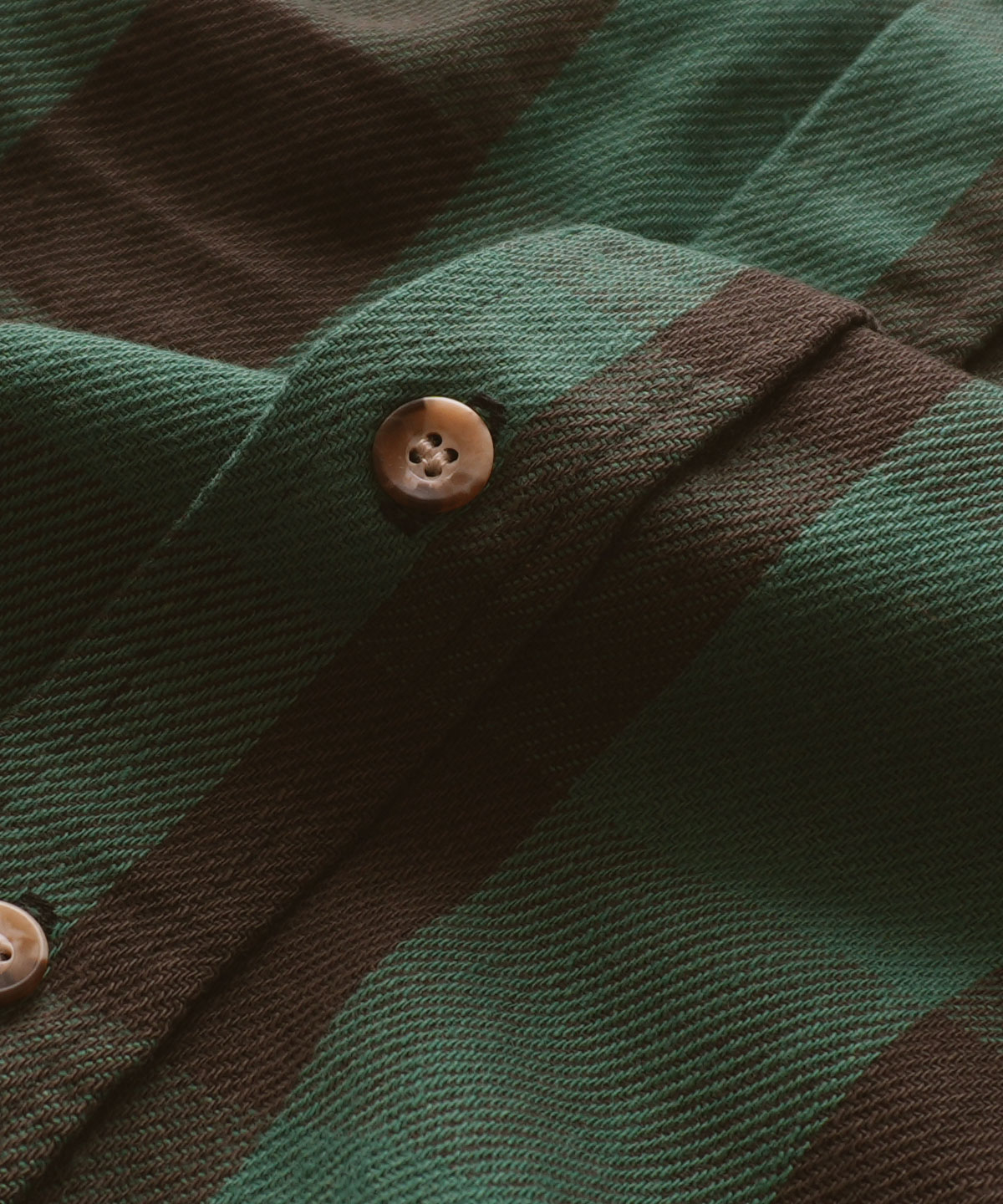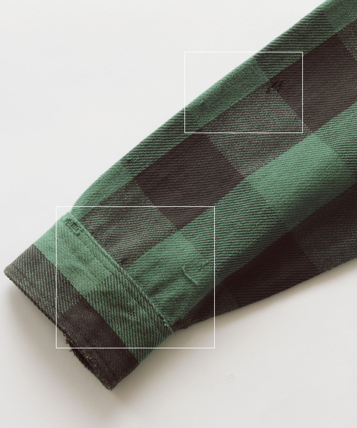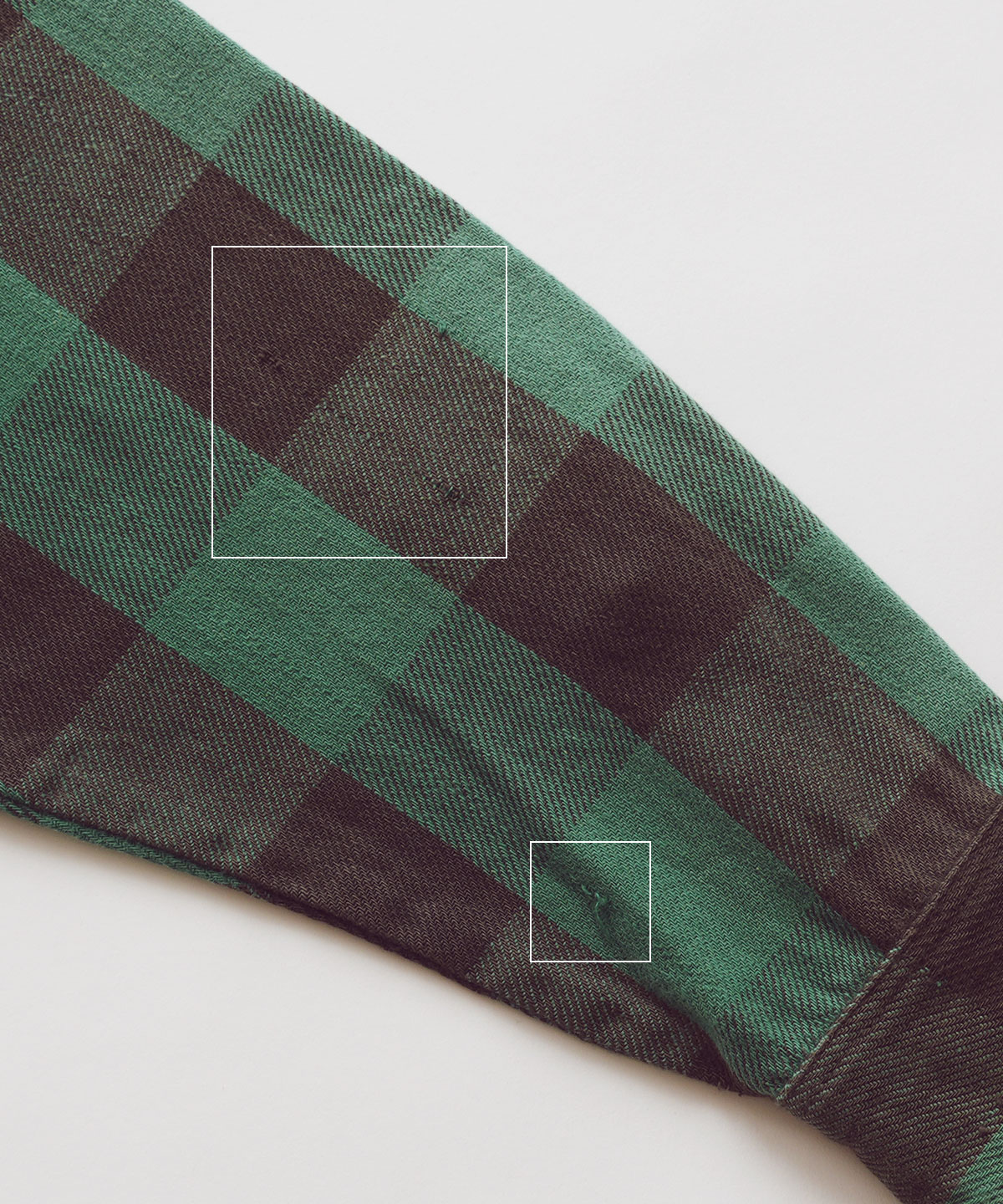 少し色褪せた緑黒のブロックチェックの色合いが、とてもオールド感あり、良い雰囲気のシャツです。