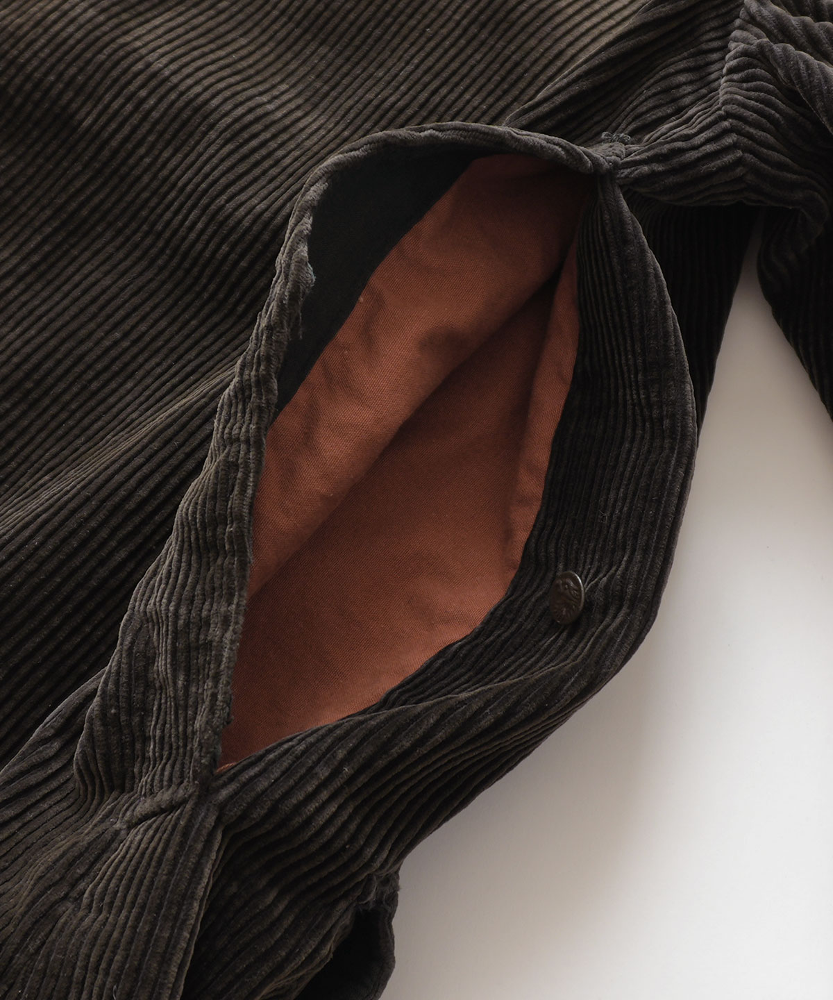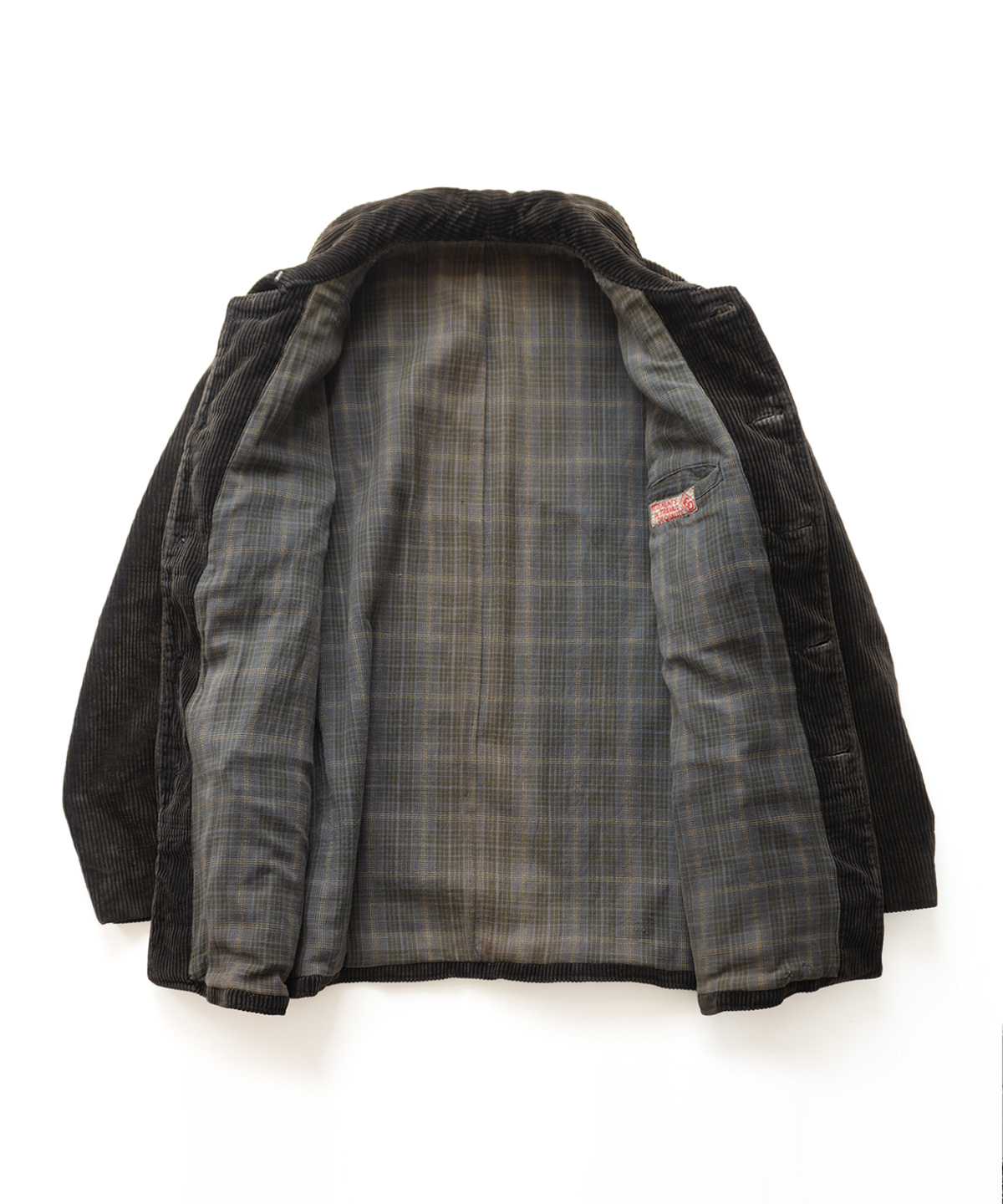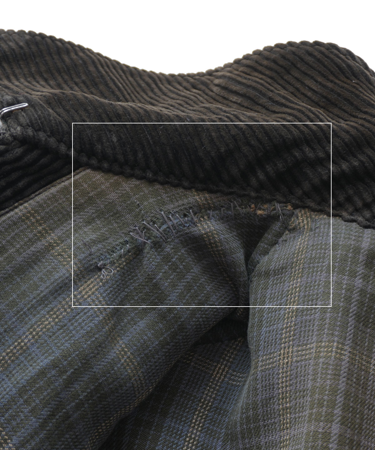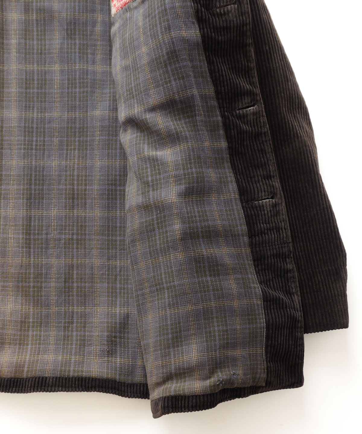 素材はおそらく100%コットンの、厚手で太畝のコーデュロイの生地で、裏地にはこちらもコットンと思われるチェック柄が織り込まれたフランネル地が使われています。