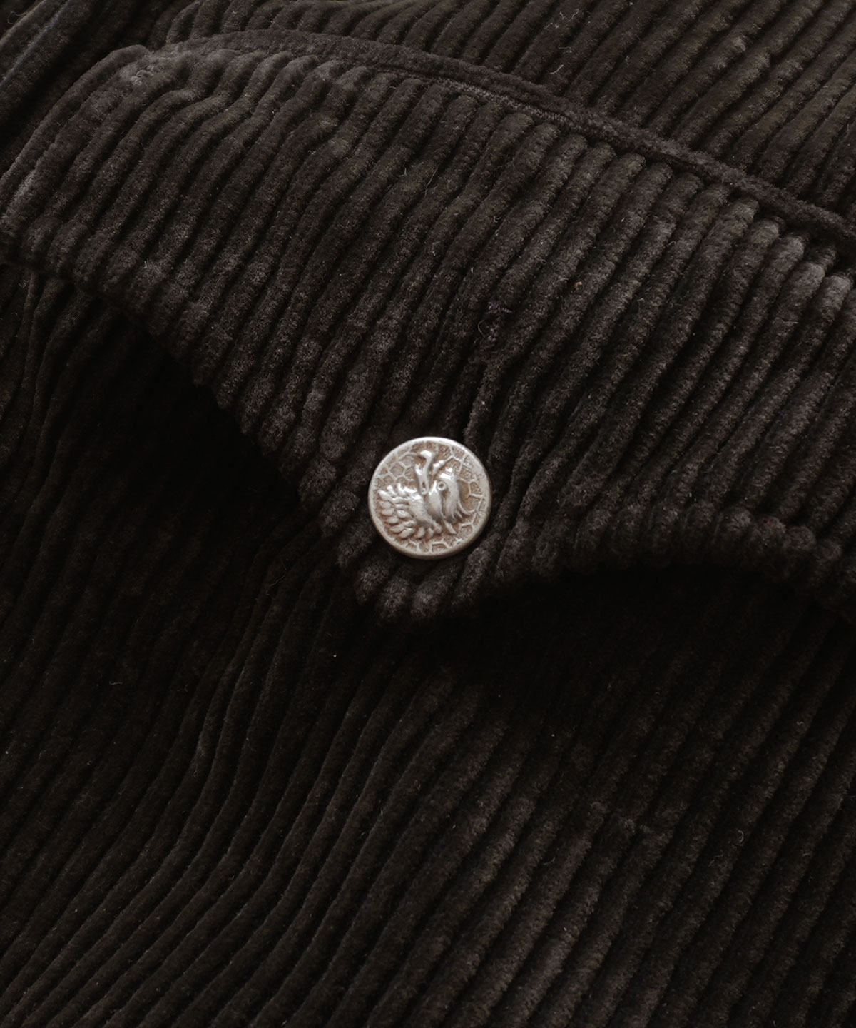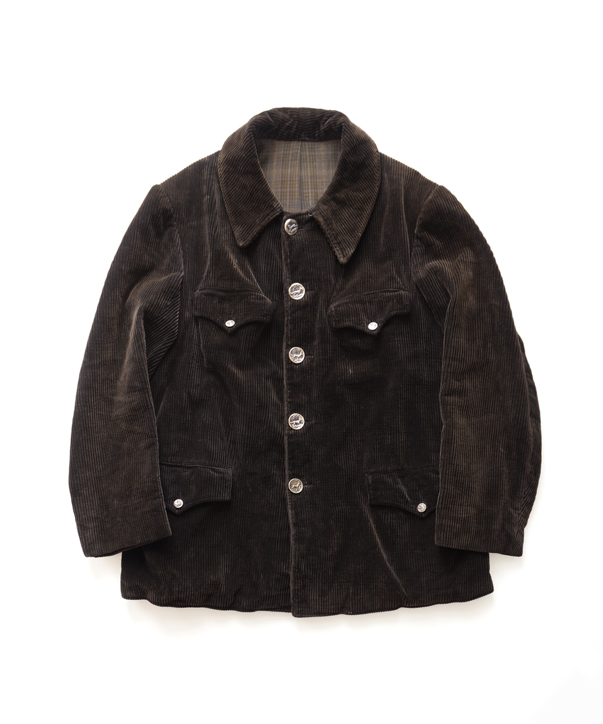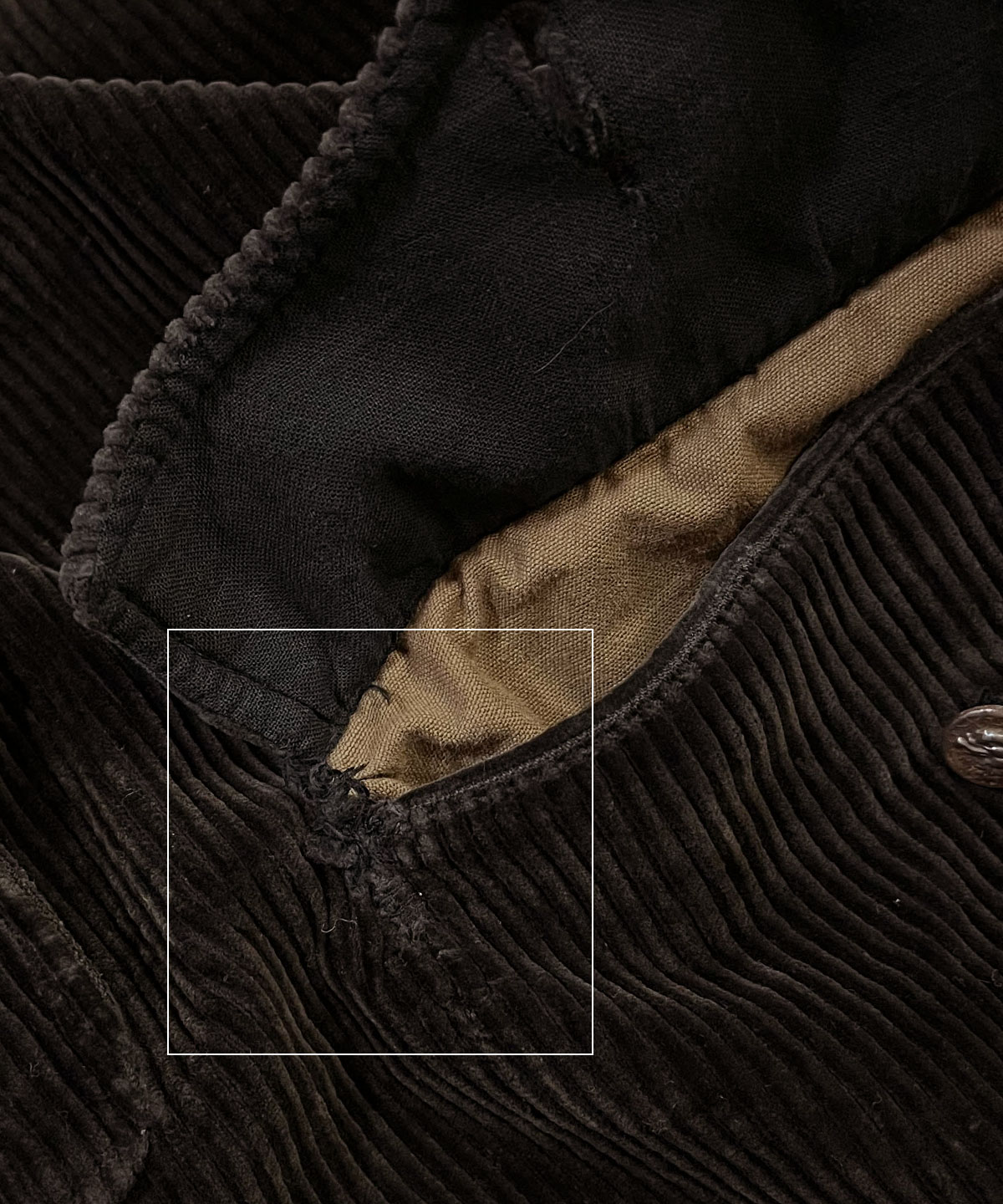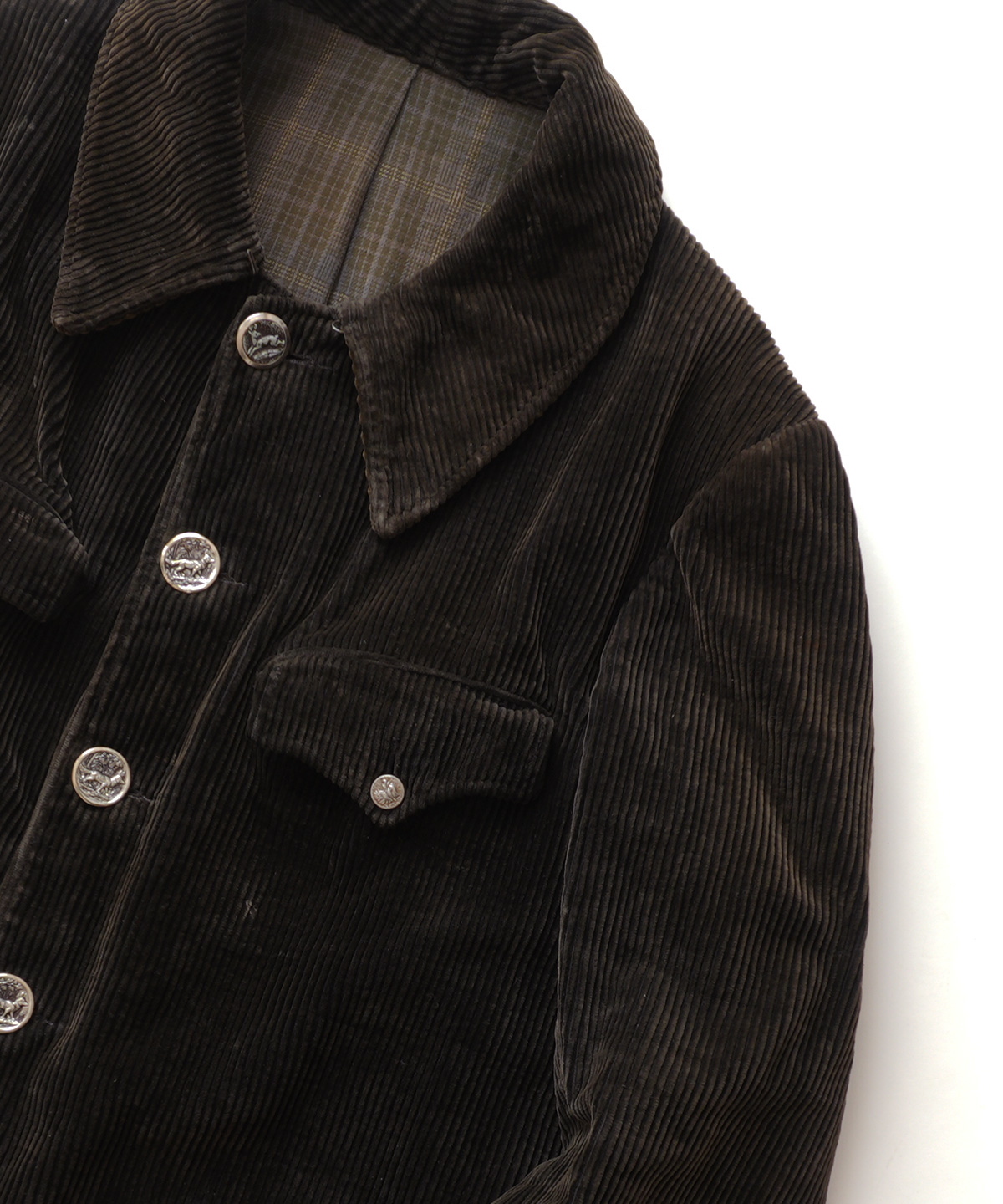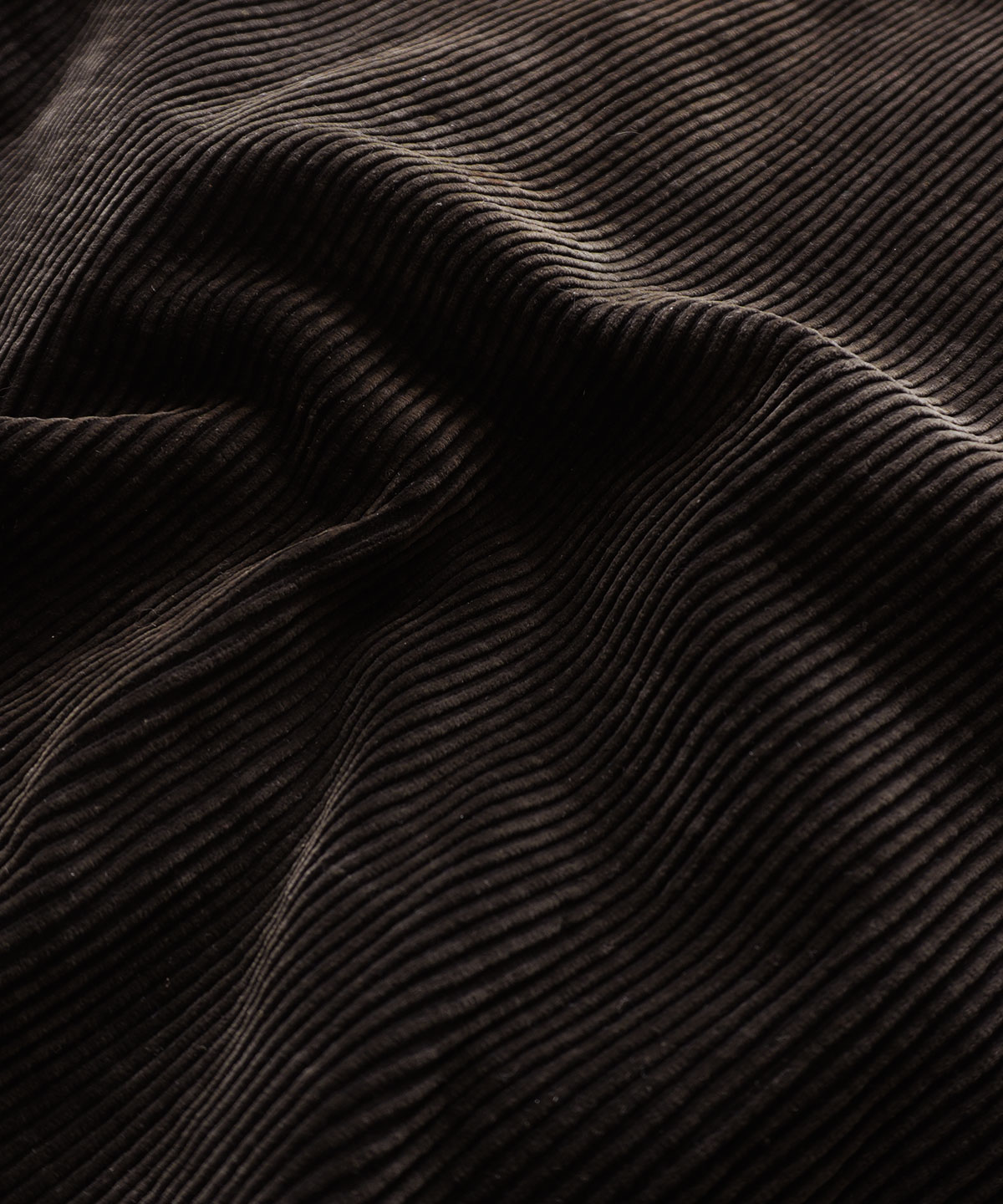 素材はおそらく100%コットンの、厚手で太畝のコーデュロイの生地で、裏地にはこちらもコットンと思われるチェック柄が織り込まれたフランネル地が使われています。