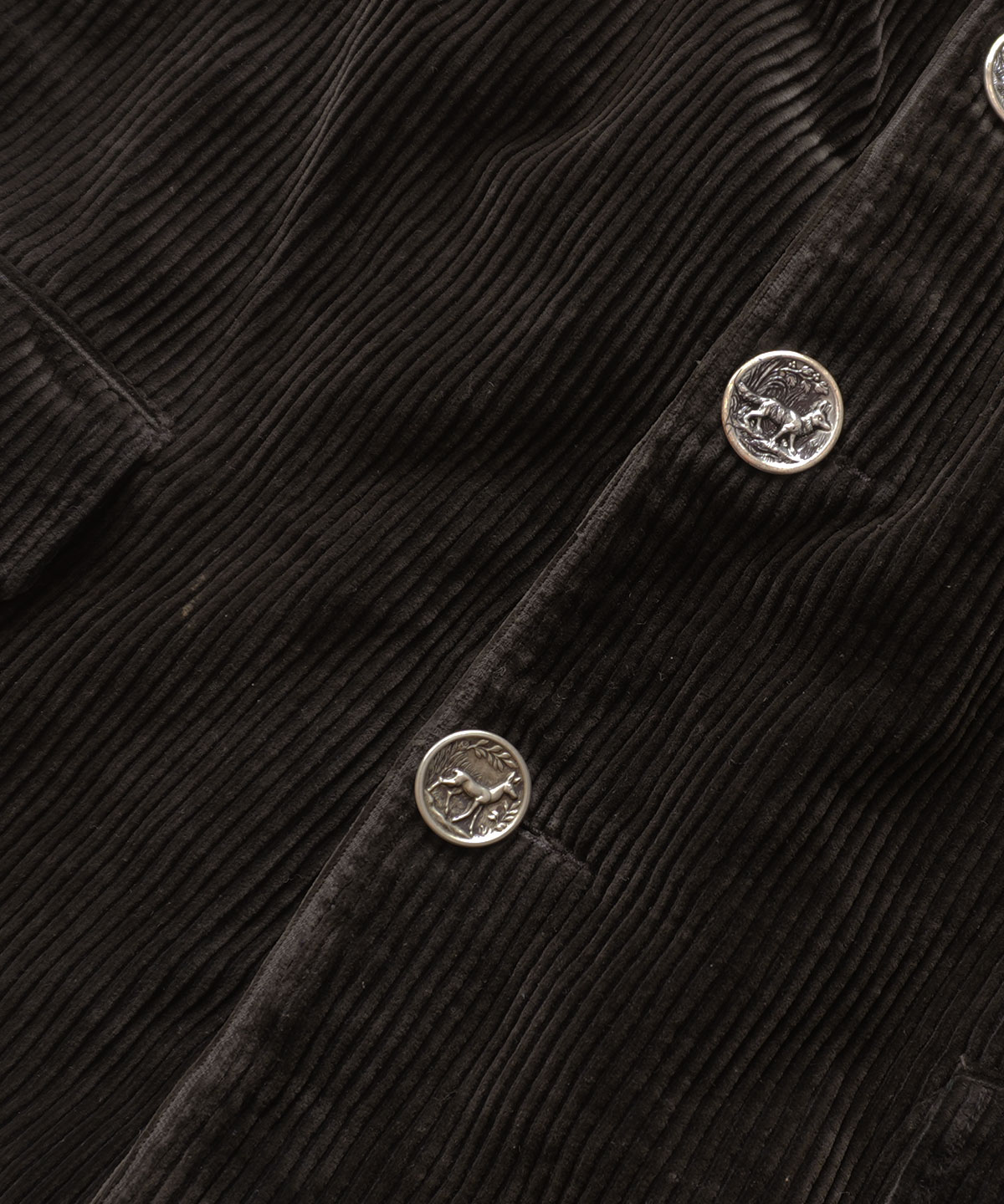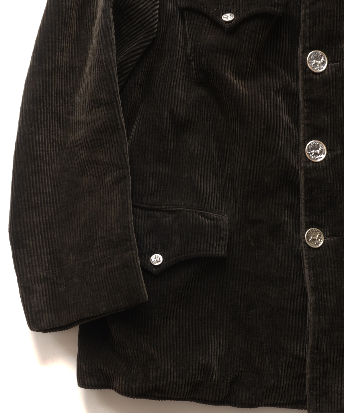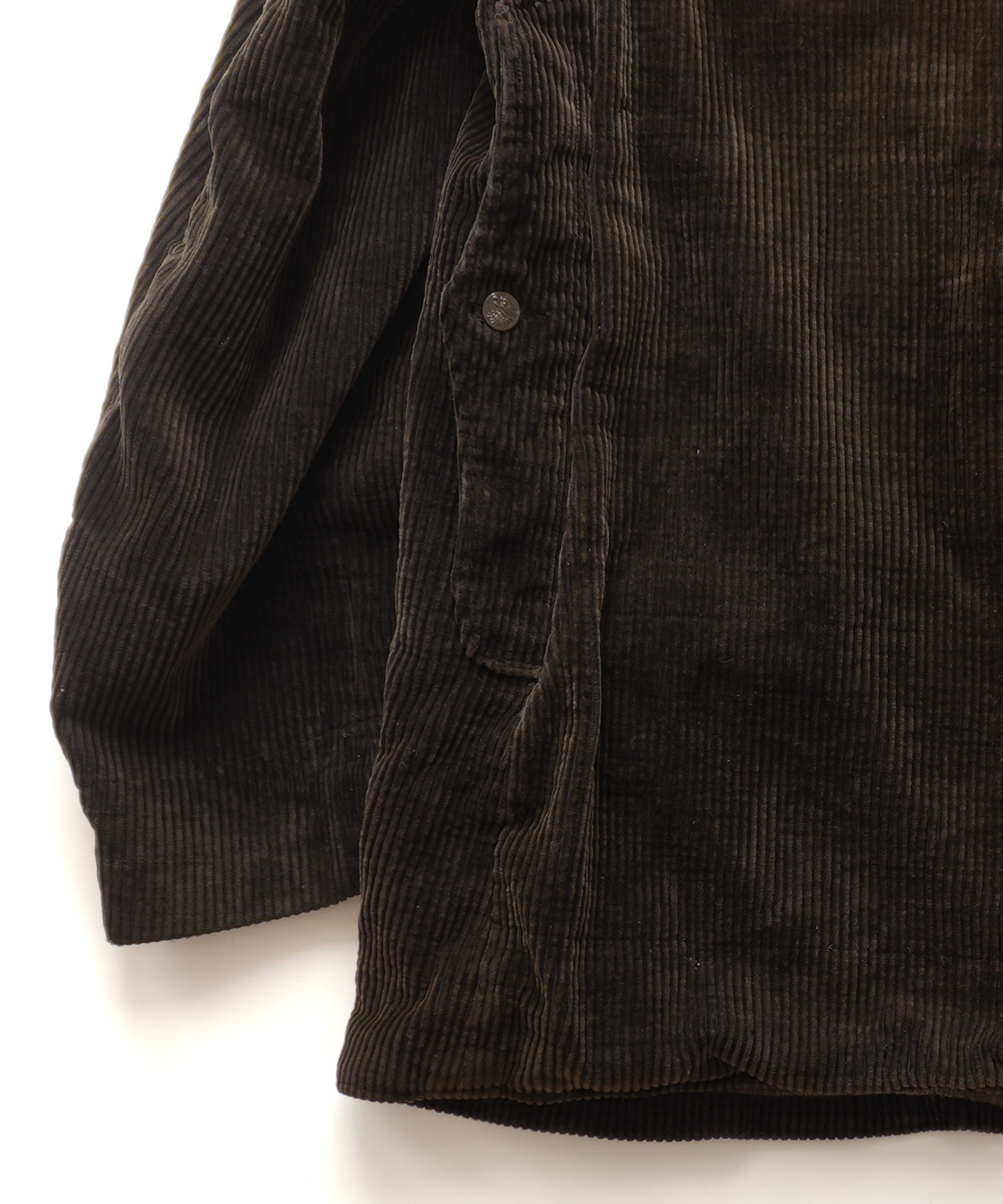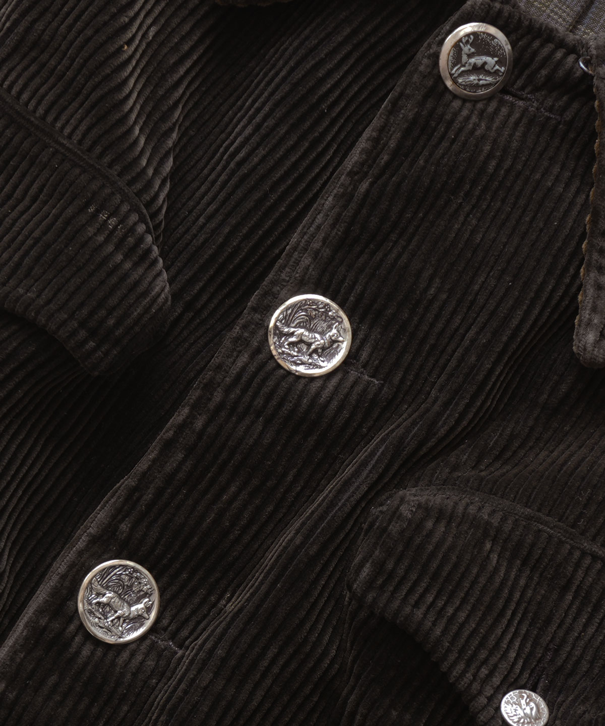 素材はおそらく100%コットンの、厚手で太畝のコーデュロイの生地で、裏地にはこちらもコットンと思われるチェック柄が織り込まれたフランネル地が使われています。