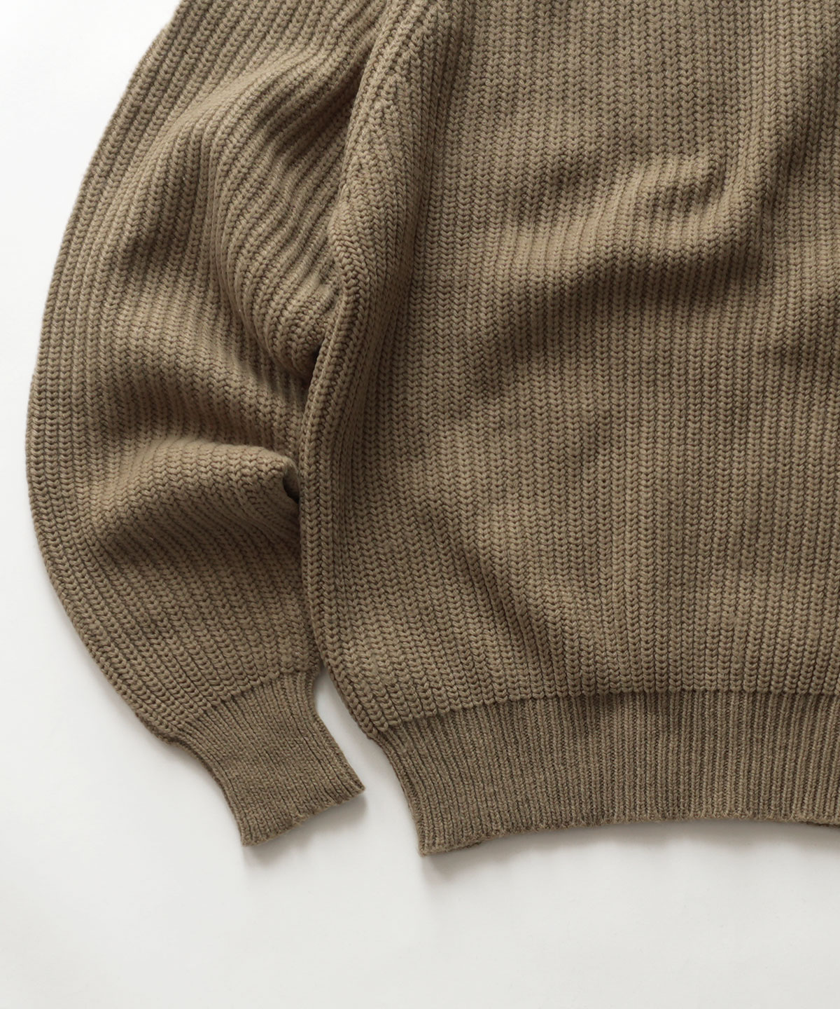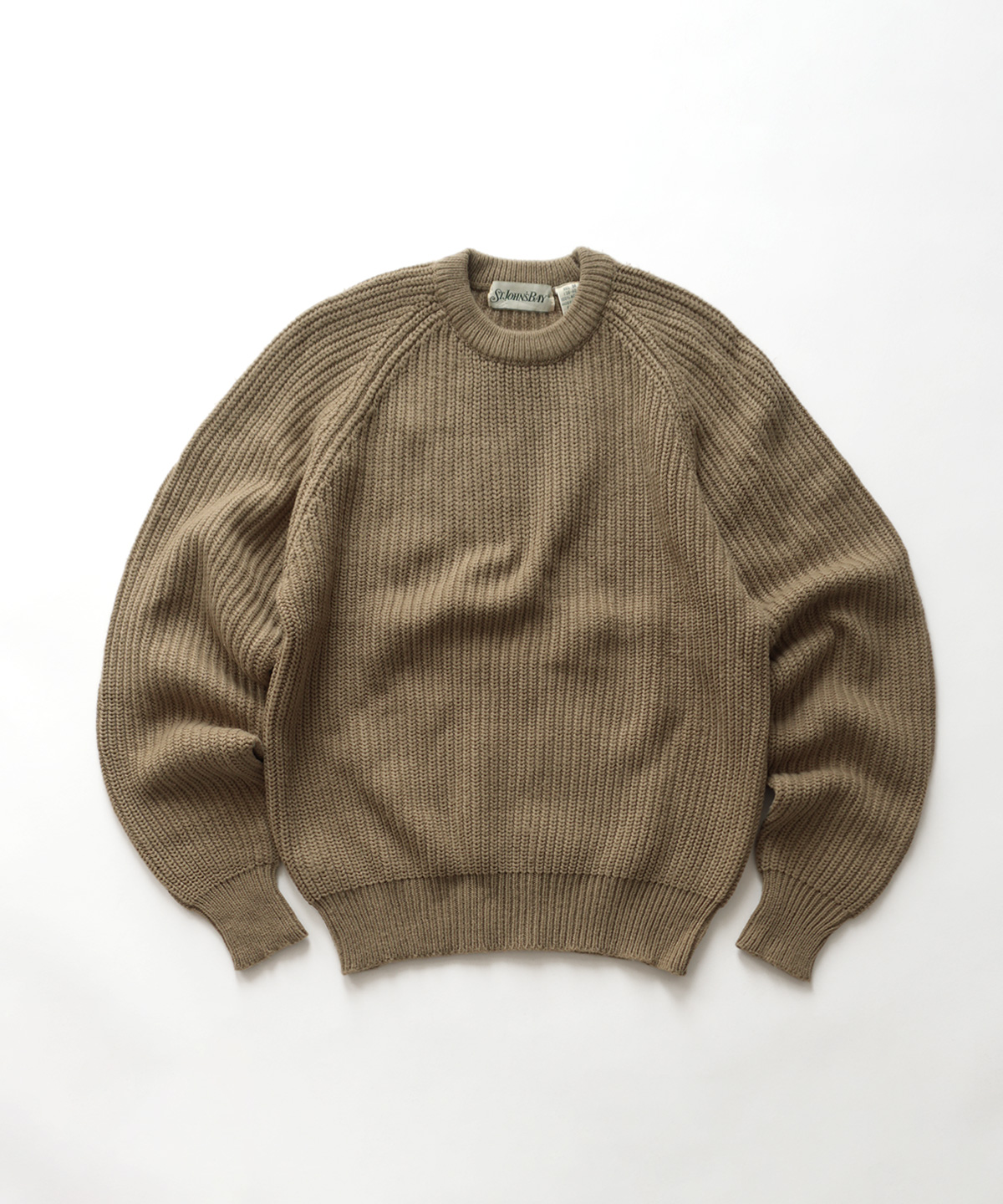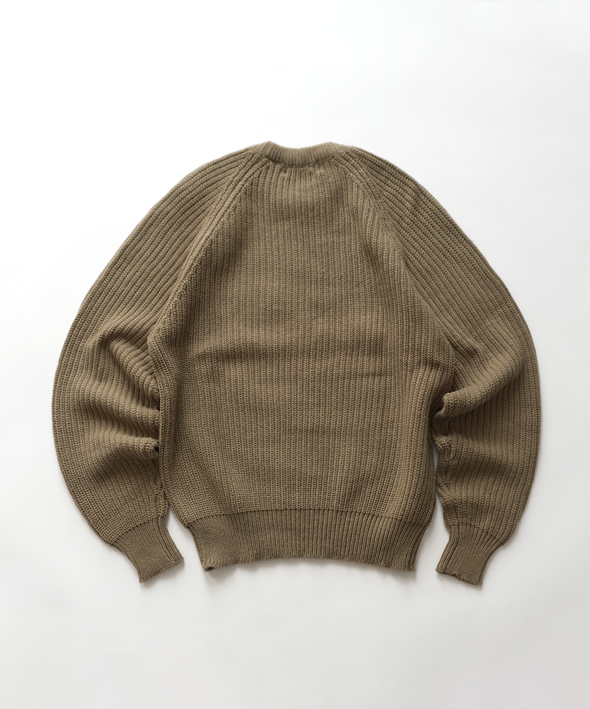 形はクルーネックで、ラグランスリーブになった丸みのある形になっています。