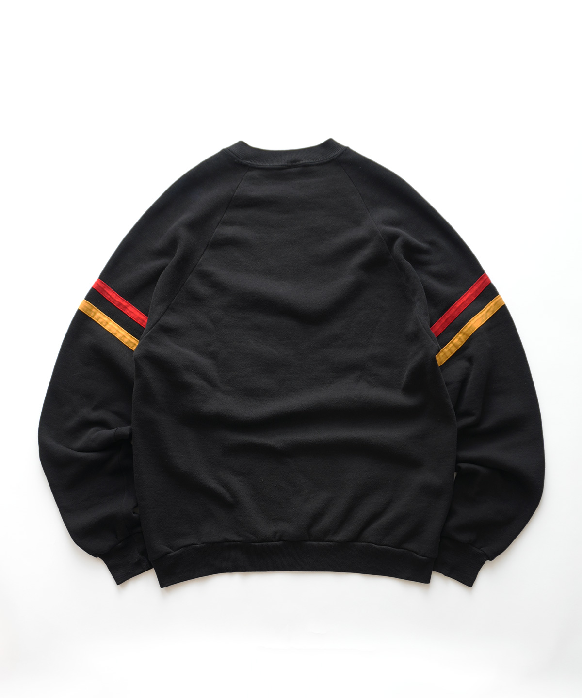 形はクルーネックでラグランスリーブの定番的な形で、両袖に2本のミッキーカラーの布が巻かれています。