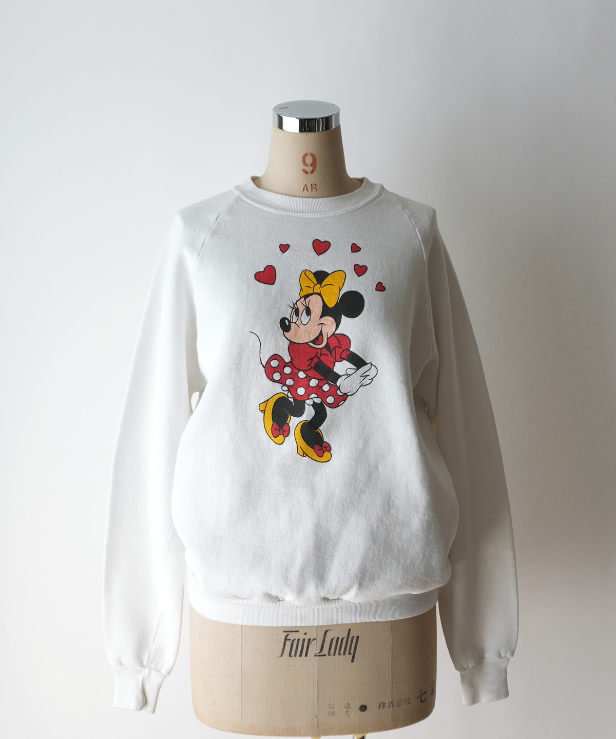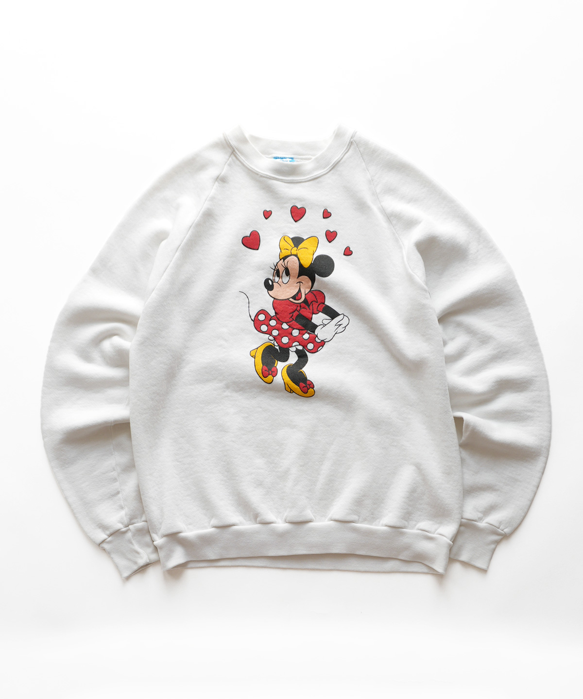 白のボディーに、少しオールド感あるデザインのミニーがとても映える、オールド感のある良い雰囲気のスウェットです。
