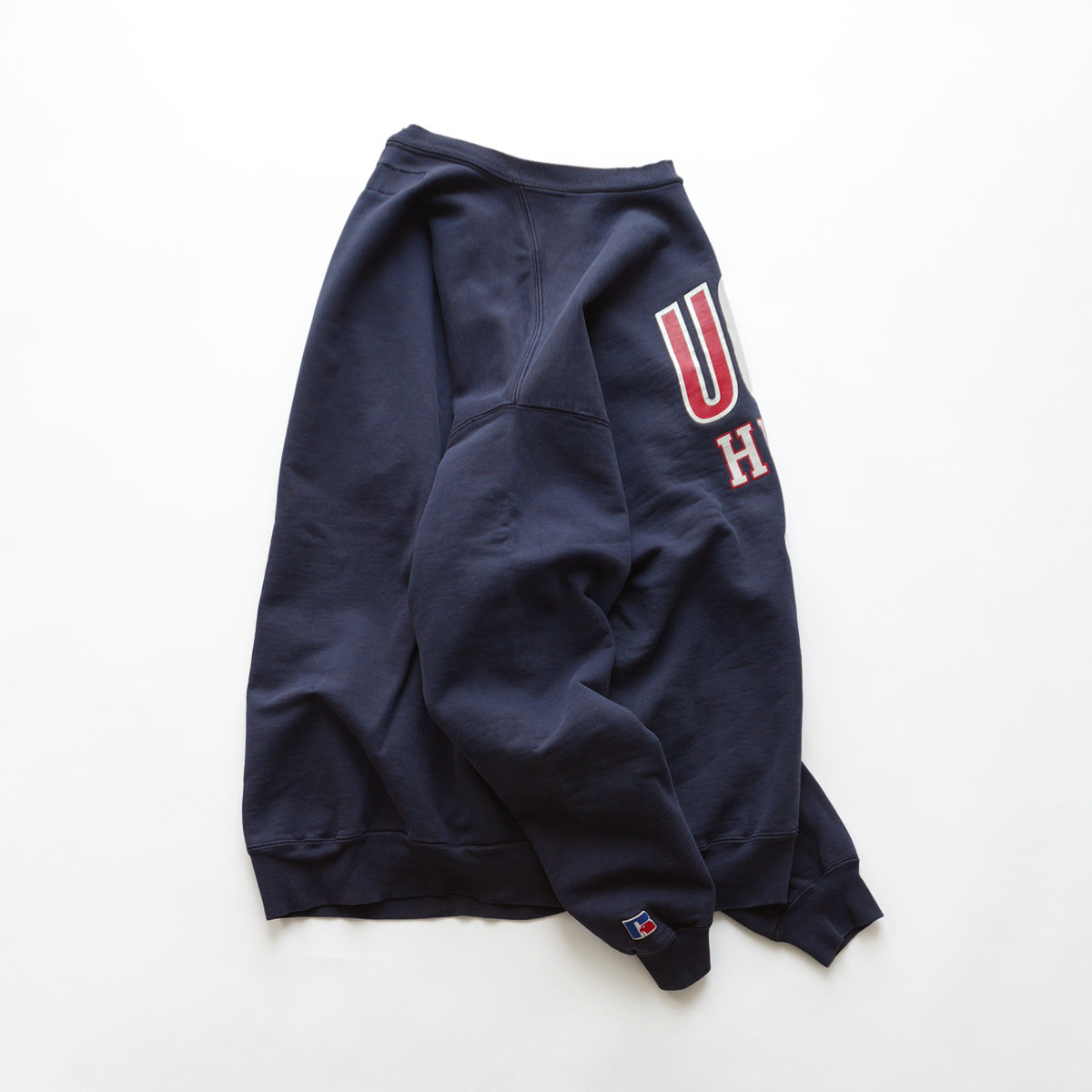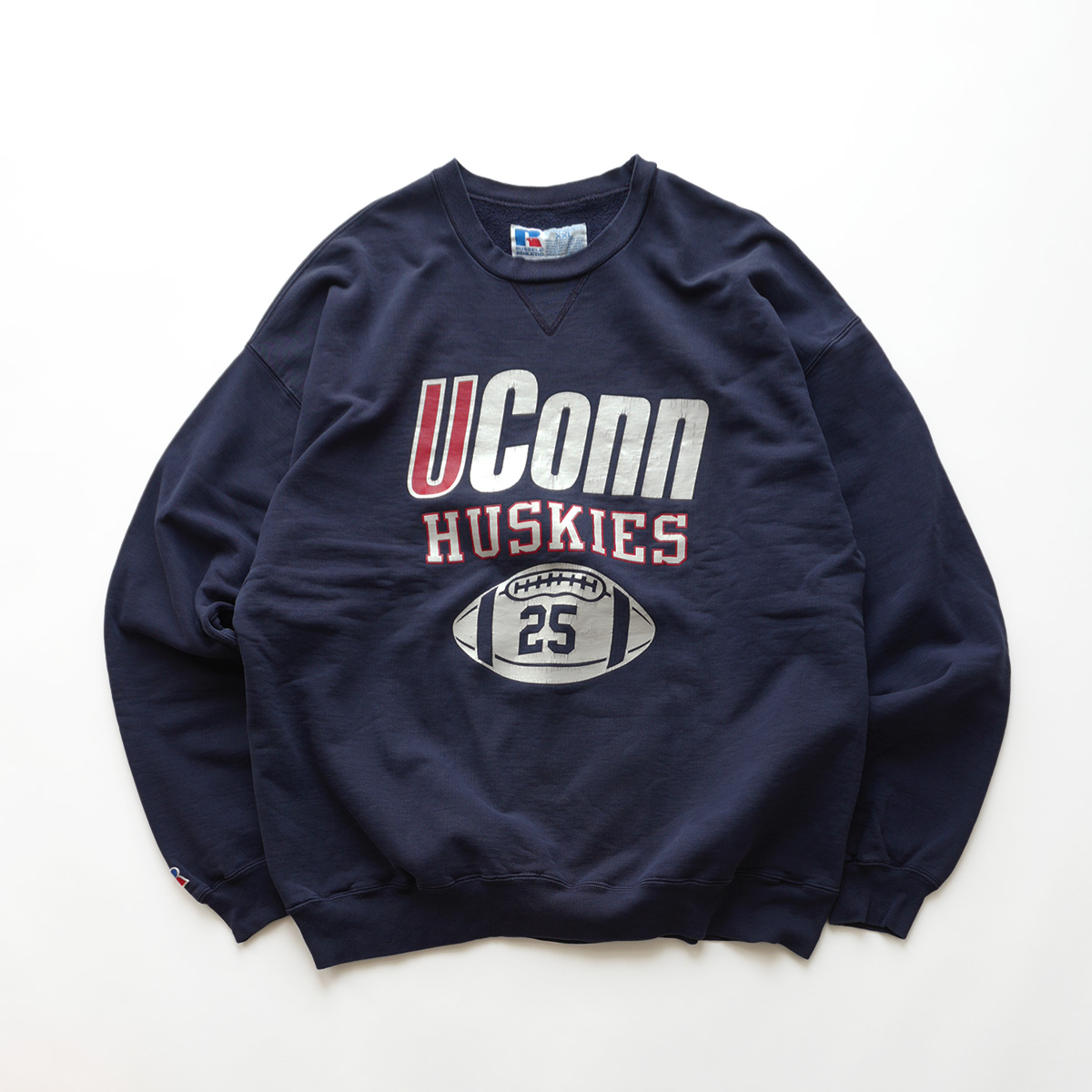 90's RUSSELL PRINT CREW NECK HEAVYWEIGHT SWEAT "UConn HUSKIES" "MADE IN USA"