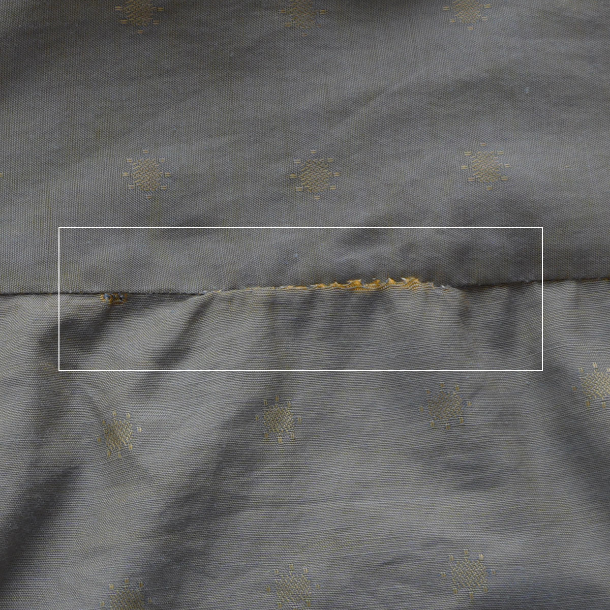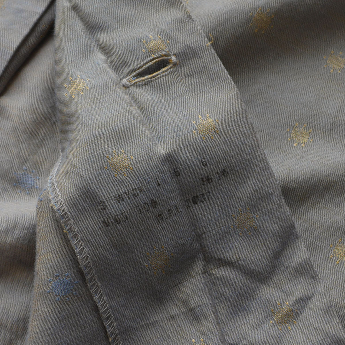 全体に細かな模様が織り込まれたおそらくドビークロスと言われる生地が使われていると思われ、独特の光沢感がある生地が使われています。