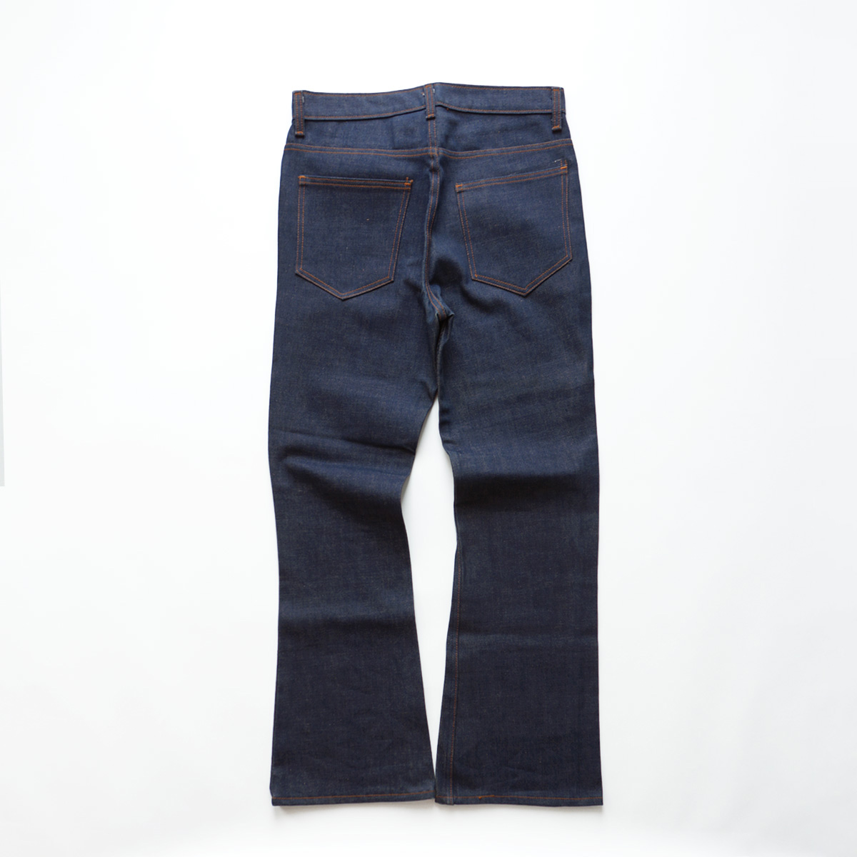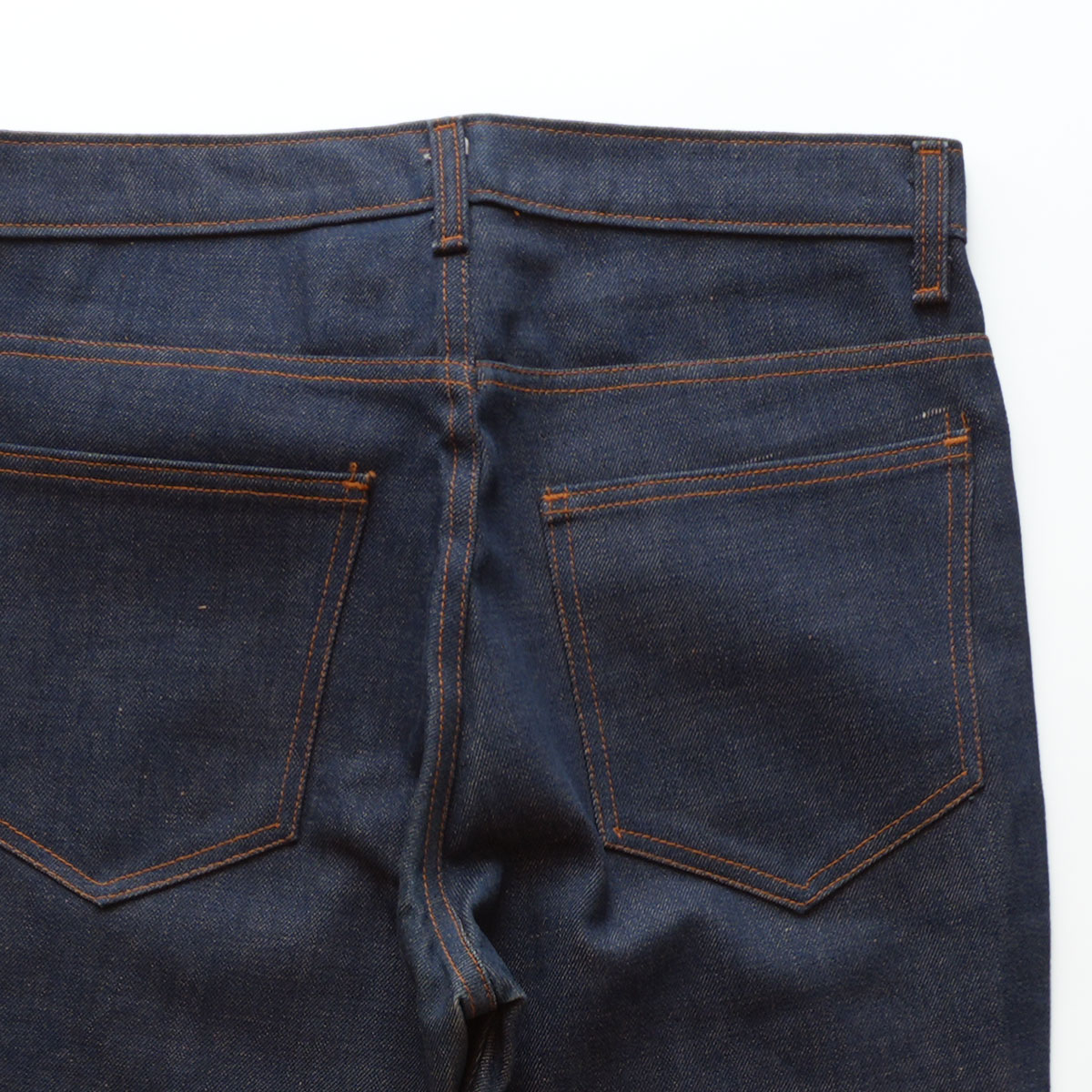 素材はおそらくコットンとポリエステルの混紡のデニム地で、未洗いのものなのでまだ少し硬さの残る生地感の物です。