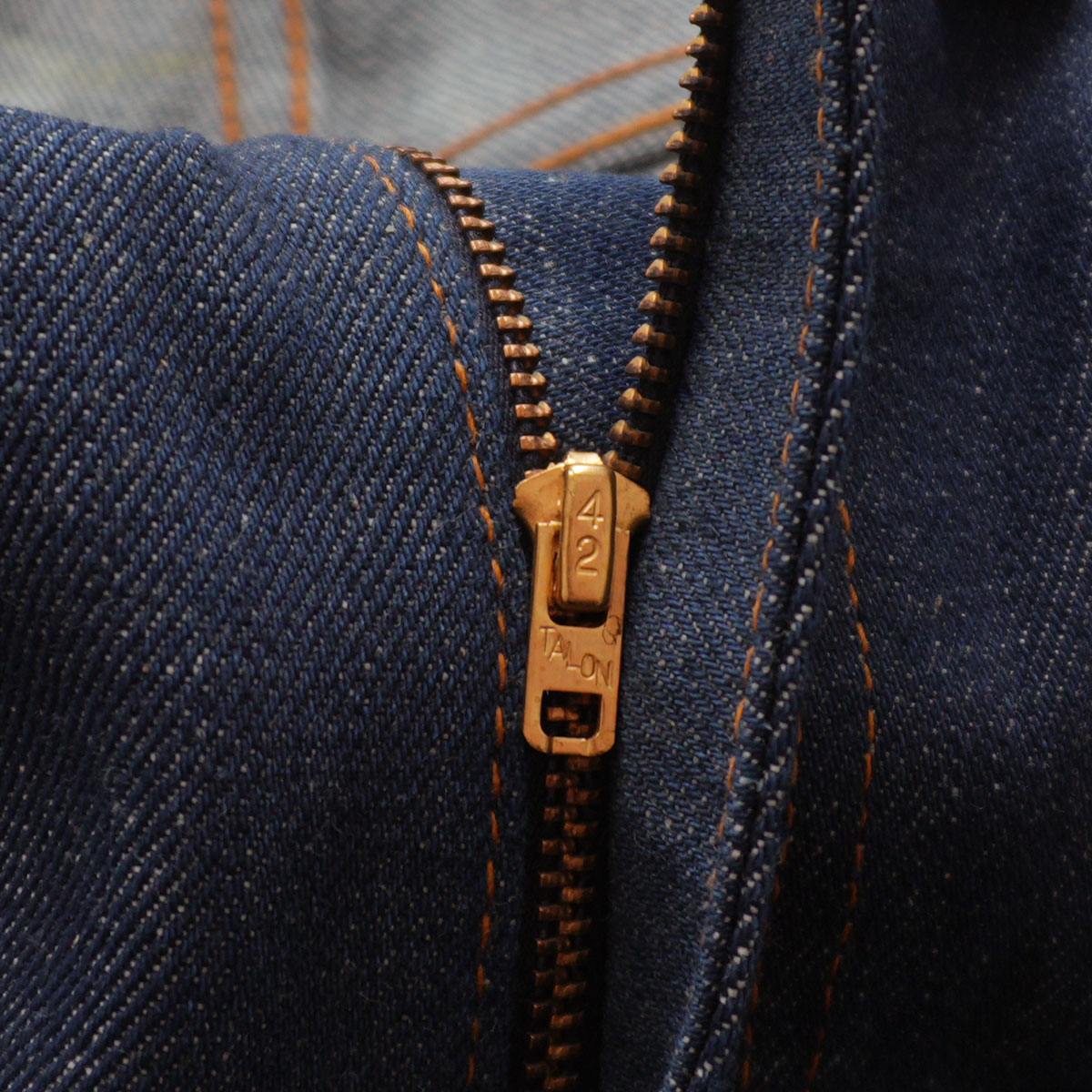 トップボタンは 王冠のような、タグにあるマークの入るものが使われ、ジップには TALON 42 ZIP が使われています。